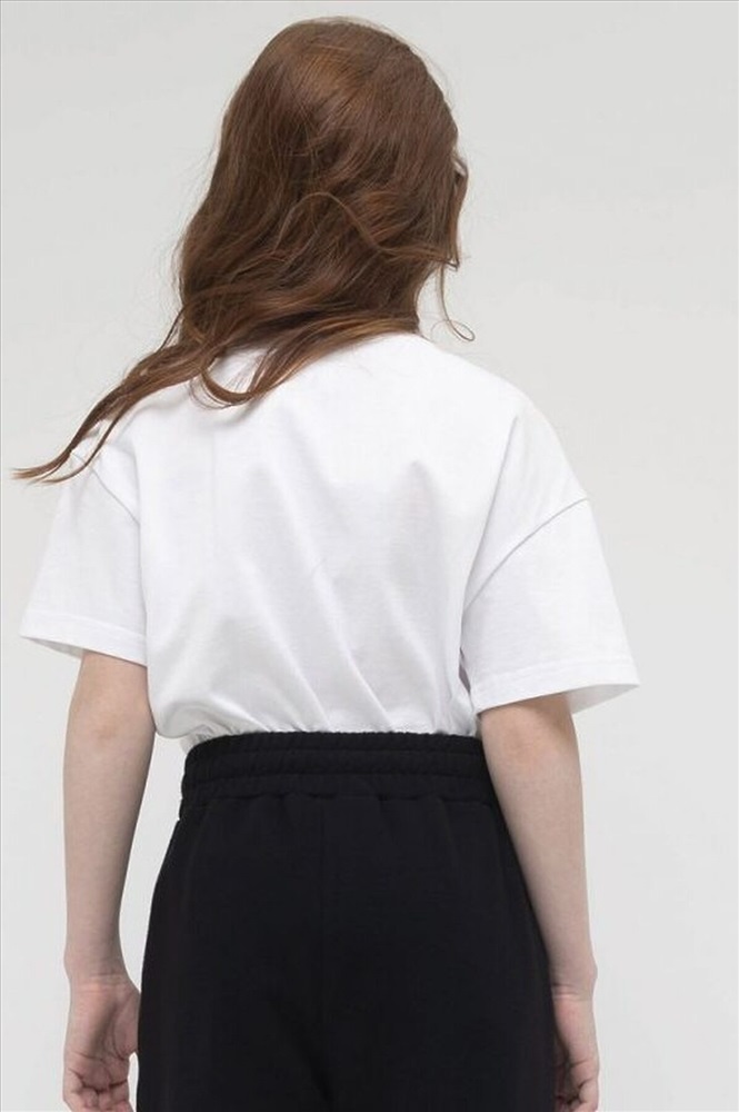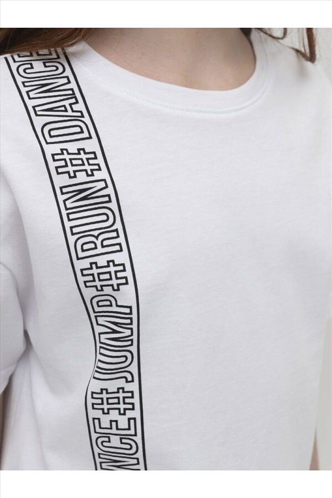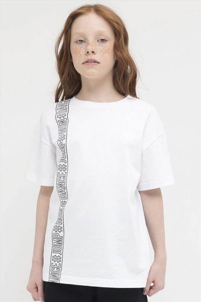 Удобная футболка для девочки из 100% хлопка. Комфортная, дышащая ткань. Модный силуэт оверсайз, обеспечивает свободу движений. Подойдет для уроков физкультуры, повседневных школьных образов и просто погулять. Легко сочетается с классическими и спортивными брюками, джинсами, юбками, шортами, лосинами.Стильный акцент на передней части: принт #танцуй#прыгай#бегай (перевод) привлекает внимание и мотивирует.