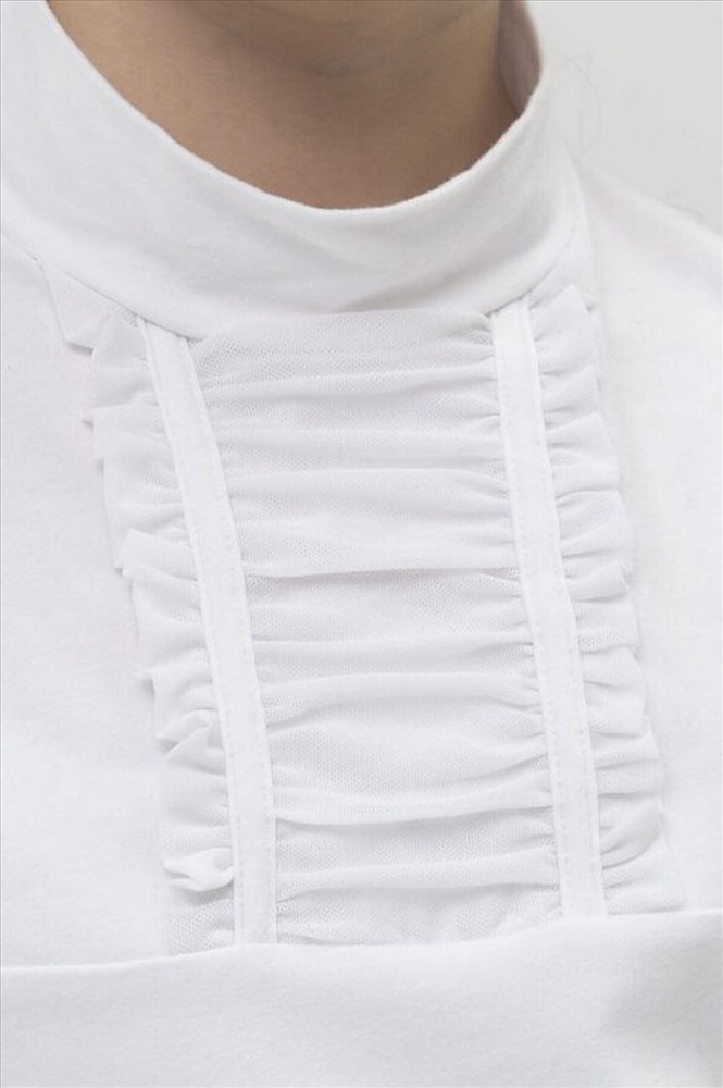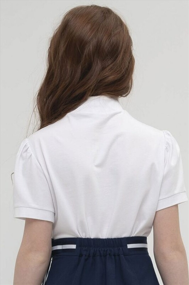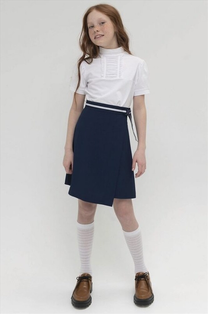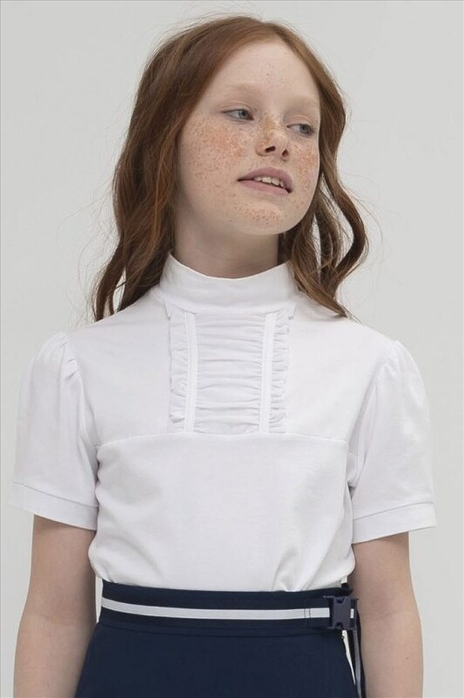 Школьная футболка для девочки в классическом стиле. Мягкая, но хорошо держит форму. В ней комфотно активно двигаться, ничего не будет тянуть. Необычная драпировка из мягкой сетки на кокетке и небольшая сборка рукава добавляют лёгкости в образ. Воротник стойка прилегает аккуратно и не давит. Практичная классика с учётом современных тенденций нужная вещь в школьном гардеробе и не только!