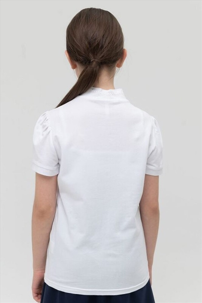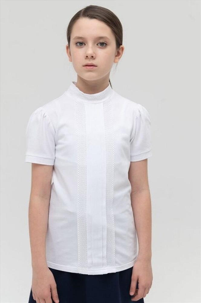 ID товара: 785762 Состав: Хлопок 97%, Эластан 3% Сезон: Демисезон Длина: Средняя Фасон: Полуприлегающий Рукав: Короткий Вырез горловины: Стоечка Рисунок: нет Тип карманов: Без карманов Декоративные элементы: Кружево Основная ткань: Хлопок Стиль: классический Страна бренда: Россия Страна производства: Китай Школьная футболка для девочки из хлопкового трикотажа. Мягкая ткань хорошо пропускает воздух, не электризуется. Кружево по бокам центральной складки спереди и по воротнику, а также лёгкая сборка рукава вносят немного романтики в классический стиль. Практична в повседневной носке, не растягивается и не теряет цвет после стирок. Комментарии к товару