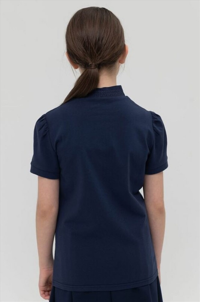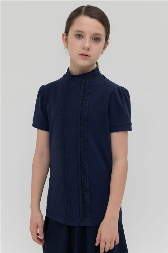 Школьная футболка для девочки из хлопкового трикотажа. Мягкая ткань хорошо пропускает воздух, не электризуется. Кружево по бокам центральной складки спереди и по воротнику, а также лёгкая сборка рукава вносят немного романтики в классический стиль. Практична в повседневной носке, не растягивается и не теряет цвет после стирок.