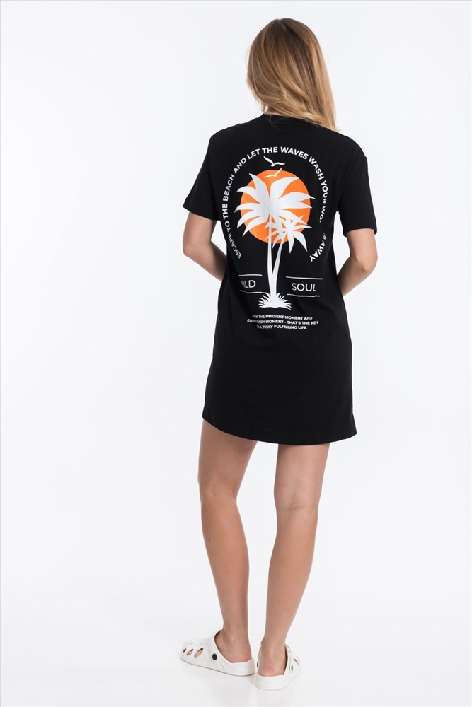 Женская футболка-платье — стильный и комфортный вариант для повседневной носки. Изготовленная из однотонной ткани, она обеспечивает свободу движений и удобство в течение дня. Короткий рукав и принт на спинке и полочке придают изделию оригинальность. Низ с закруглениями к боковым швам добавляет платью женственности. Такая футболка-платье подойдёт для прогулок, неформальных встреч или отдыха. Её можно сочетать с различными аксессуарами и обувью.