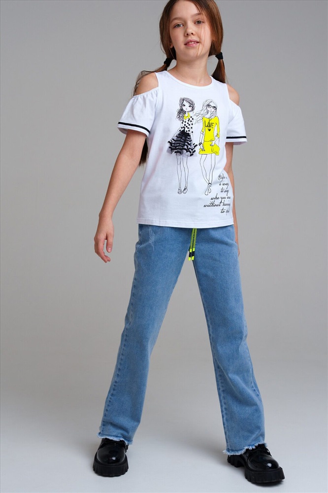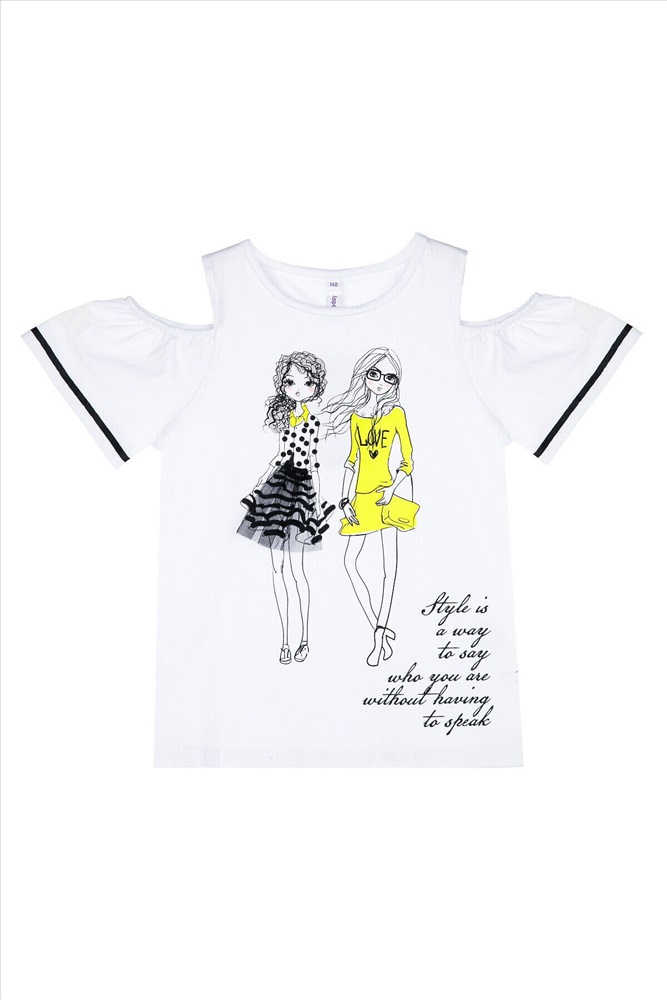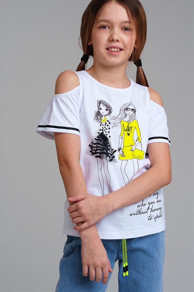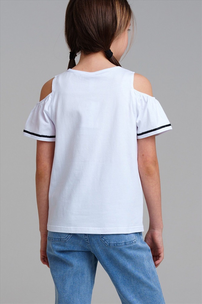 Футболка с открытыми плечами из качественного и приятного на ощупь трикотажа джерси. Высокое содержание хлопка 95%. Благодаря наличию эластана в составе ткани изделие проще в уходе и держит форму. Regular fit.