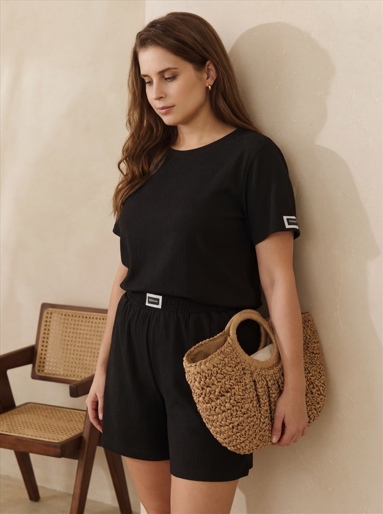 Футболка женская из гладкокрашенного трикотажного полотна «бурумчук», прямого силуэта, с короткими втачными рукавами, горловиной овальной формы, обработанной втачной планкой. По центру полочки ниже горловины - настрочен декоративный элемент-нашивка.