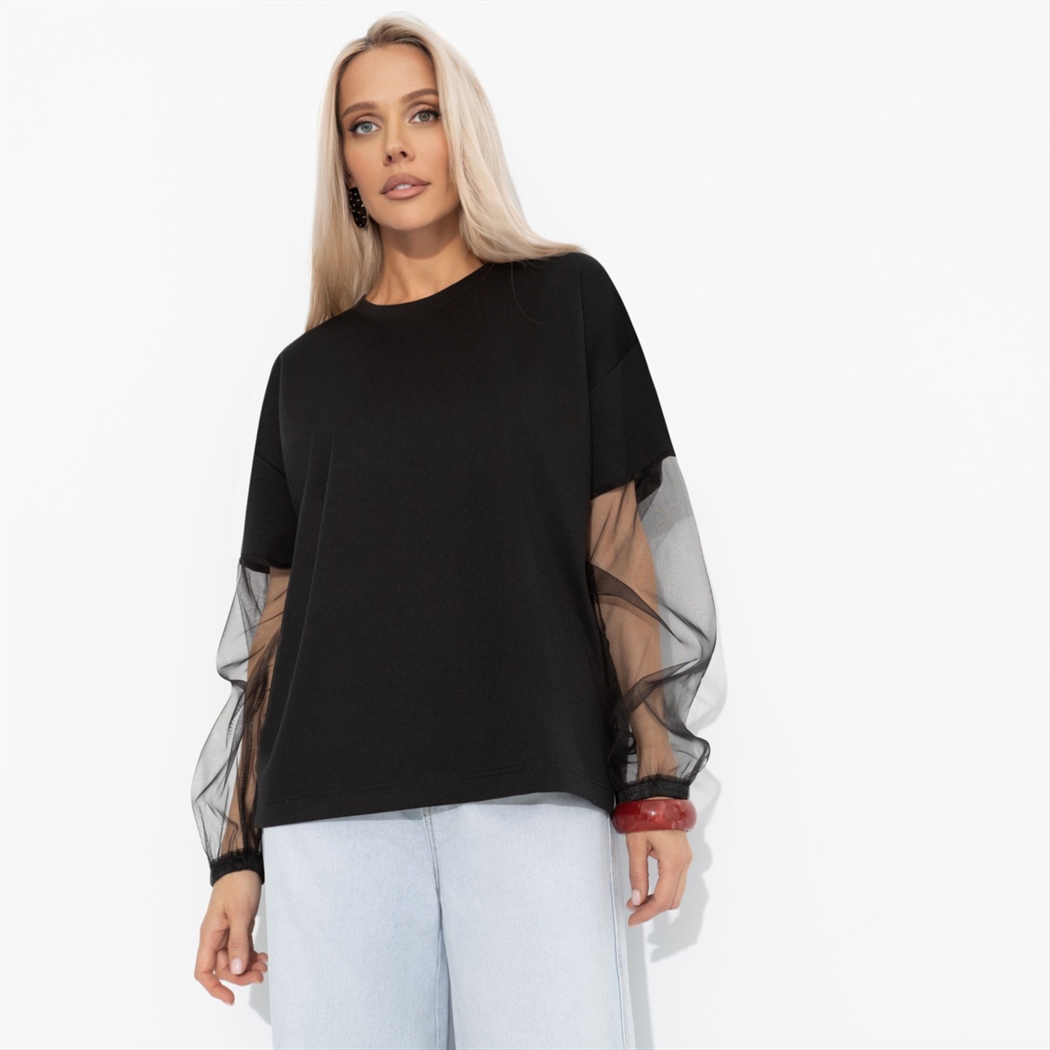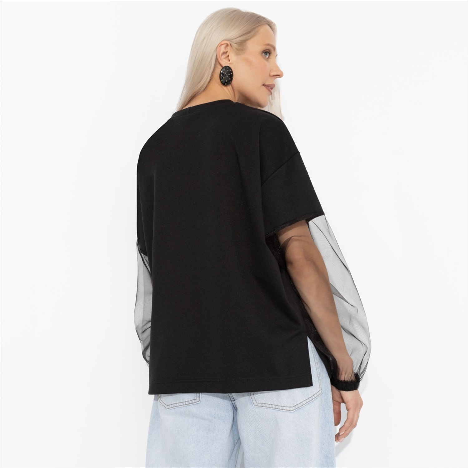 Заказывали мгновенное преображение из комфортного образа в стильный? Прозрачные рукава добавляют ноту смелой чувственности, не жертвуя при этом непринуждённой эстетикой. Футболка легко сочетается с кожаными брюками для вечеринки или с джинсами для повседневного шика. Футболка свободного кроя. Часть рукавов оформлена тонкой сеткой. Манжеты рукавов прошиты из основного материала. Линия плеча спущена. Деликатные разрезы по бокам изделия.