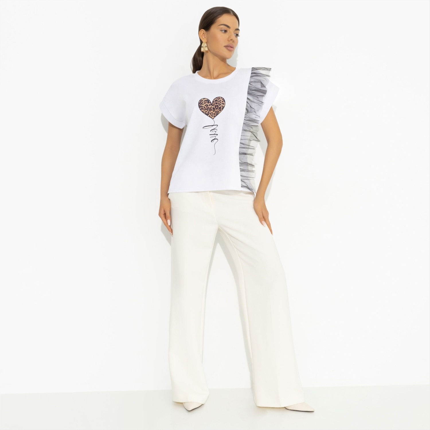 Морнинг рутин от CHARUTTI: проснуться без будильника, умыться, нанести тринадцать ступеней утреннего ухода и надеть футболку CHARUTTI, в которой легко можно провести весь день, чем бы вы не занимались. Футболка прямого силуэта из эластичной ткани. Отвороты на рукавах прошиты. Принт напечатан на ткани. Объемный асимметричный декор из сетки вшит.