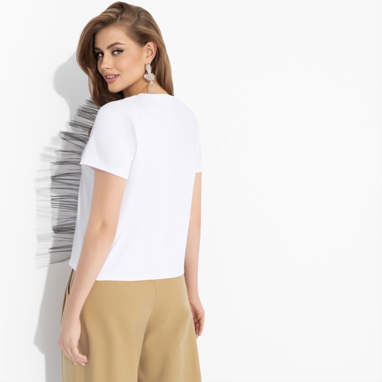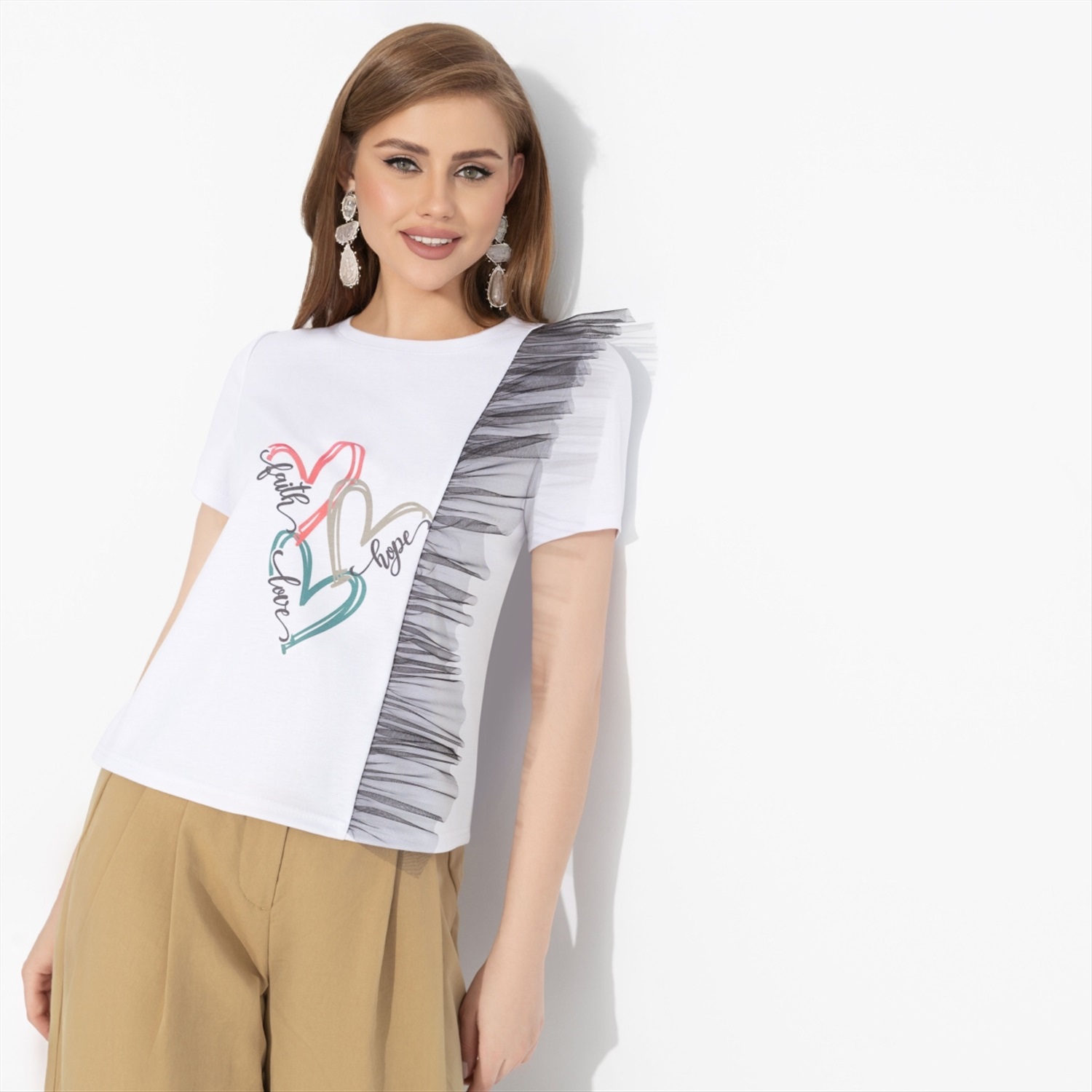 Твоя история начинается с нового гардероба. Для уверенных и роскошных шагов в светлое будущее выбирай футболку CHARUTTI. Сердечки здесь - как символ того, что все будет восхитительно. Футболка классического силуэта. Принт напечатан на ткани. Изделие дополнено объемной рюшей из сетки по одной стороне изделия.