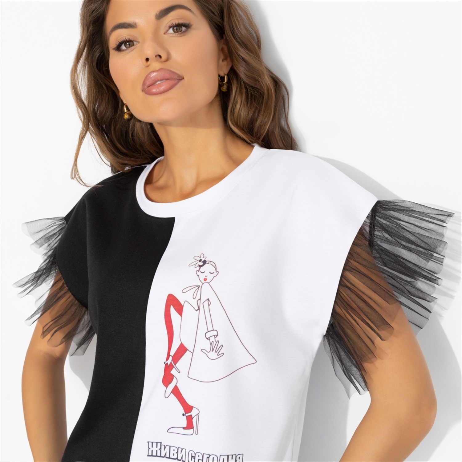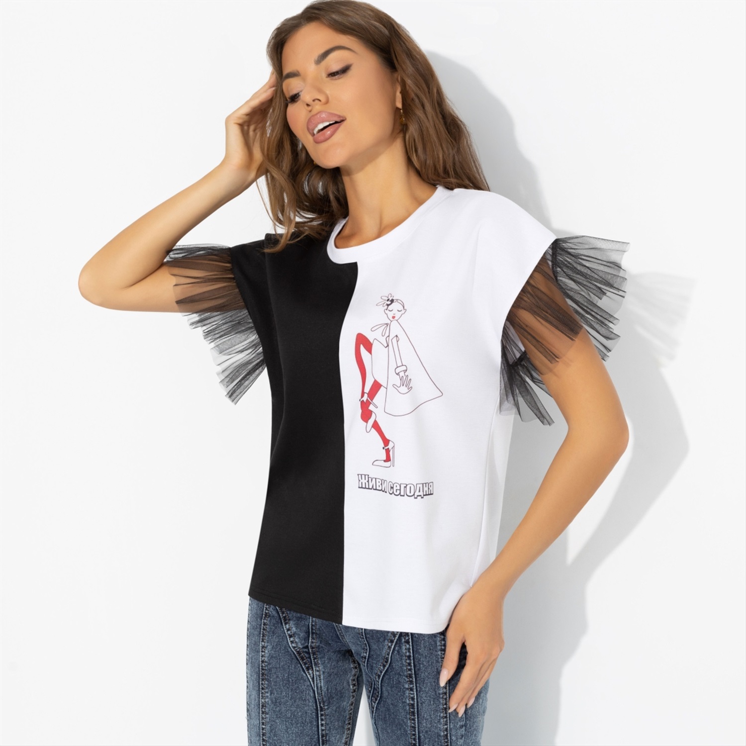 Искра, буря, безумие… В такой футболке-заявлении от ЧАРУТТИ вы всегда ‒ то самое первое впечатление: контрасты, акцентные рукава и стиль, который запоминается с первой секунды. Живи сегодня! Футболка из трикотажа «милано» с черно-белым колорблоком и рукавами из фатина. То, что нужно для событий и встреч, где важна харизма. Надпись на изделии: «Живи сегодня!».