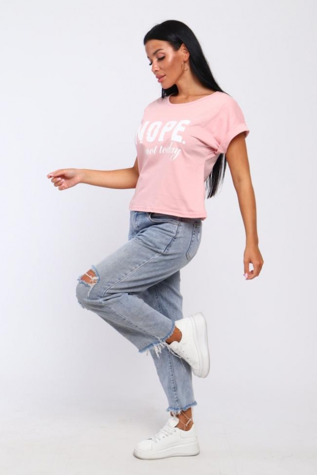 Футболка женская укороченная со спущенным плечом, округлым вырезом горловины и широкими рукавами с подворотами. Свободный крой и оригинальная надпись Nope делает ее актуальной в любом сезоне лето, осень. Современный дизайн и оригинальный крой подойдет для девушек подростков и более взрослой аудитории. Состоит из 100% хлопка (кулирка).