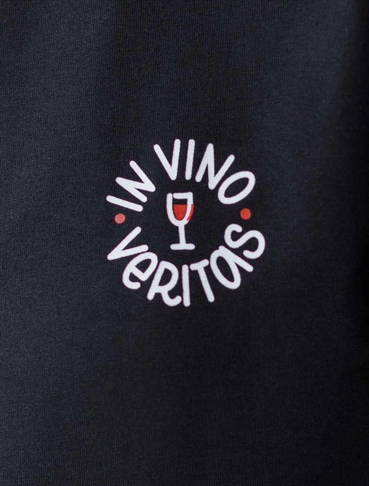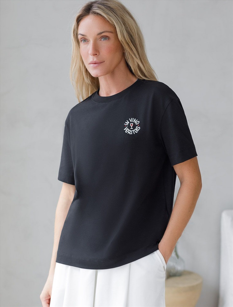 Состав: 92%Хлопок 8%ПУ; Плотность: 170 Г/м2; Размер товара на первом фото: 42 Футболка черного цвета изготовлена из премиального хлопка с эластаном, она обеспечивает невероятное ощущение уюта и легкости. Натуральный материал сохраняет форму и цвет после множества стирок, обеспечивая долговечность изделия, а его высокая воздухопроницаемость создает ощущение свежести даже в течение долгого дня. Особое внимание привлекает стильный принт в виде бокала с минималистичной надписью. Перевод надписи: In vino veritas - Приходит вино - уходит истина. Принт выполнен красками с устойчивым покрытием, который добавляет изделию оригинальности и позволяет выразить индивидуальность. Свободный крой футболки дарит удобство и не стесняет движений, что делает ее идеальной для повседневной носки или активного отдыха, подчеркивает современный взгляд на моду. На рукаве металлический логотип бренда. Подойдет девушкам и женщинам на любую фигуру, вы будете чувствовать себя в ней уверенно и комфортно. Отлично впишется в гардероб благодаря универсальному дизайну, который легко сочетать с джинсами, шортами или спортивными брюками.