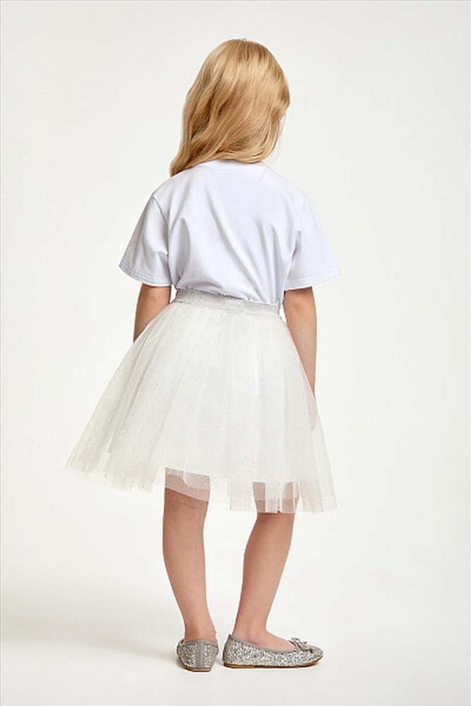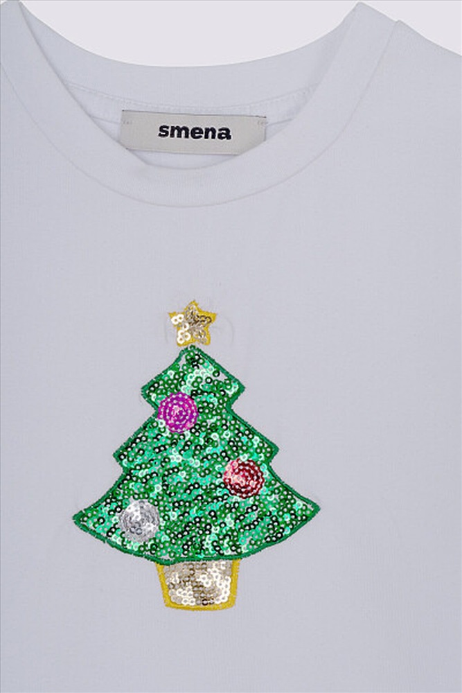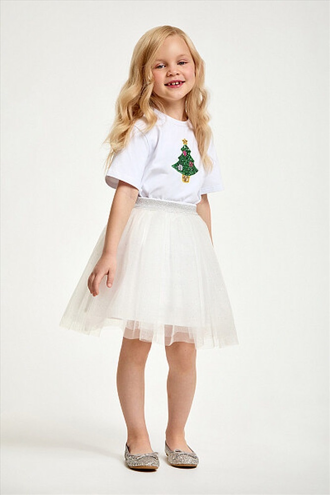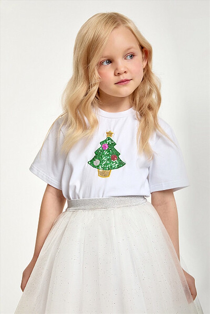 Стильная белая футболка для девочек свободного силуэта, которая подойдет для любого зимнего торжества. Она идеально сочетается как с брюками, так и с юбкой. Футболка изготовлена из мягкого и нежного хлопка, который прекрасно сидит на фигуре и не сковывает движения во время активных игр. Оригинальная аппликация из блестящих пайеток придаст образу оригинальности и яркости.