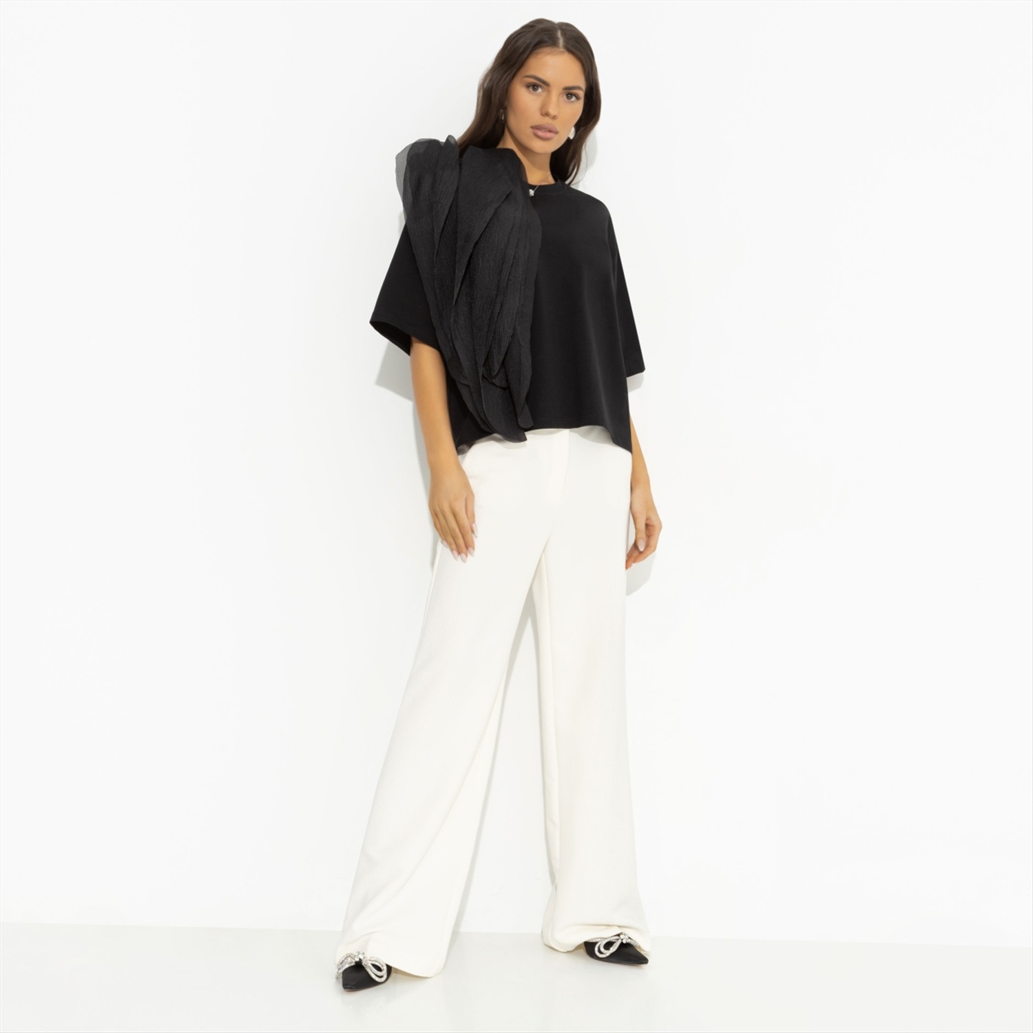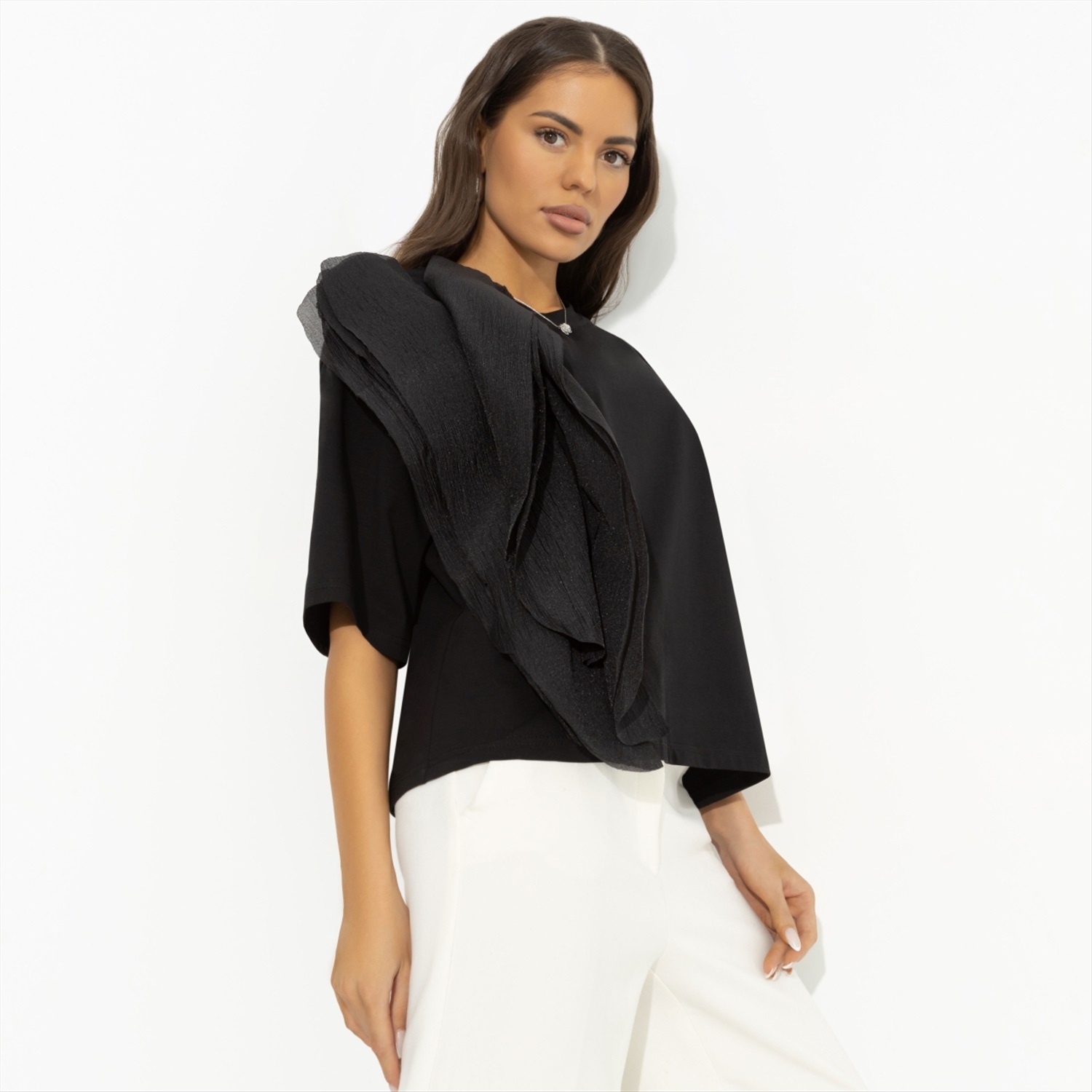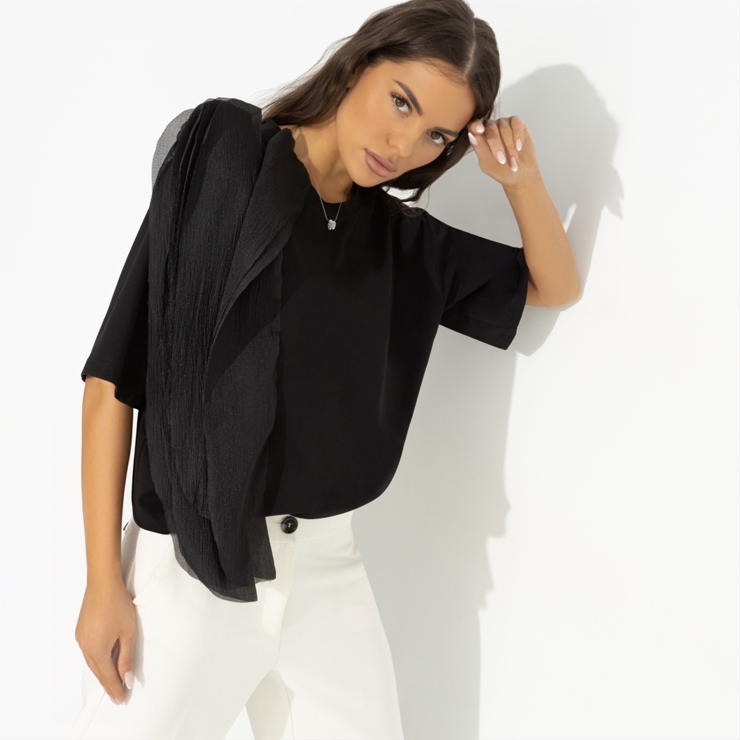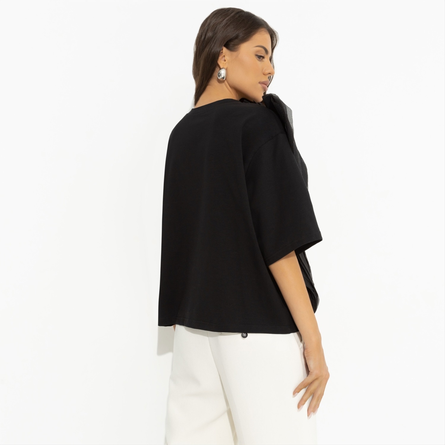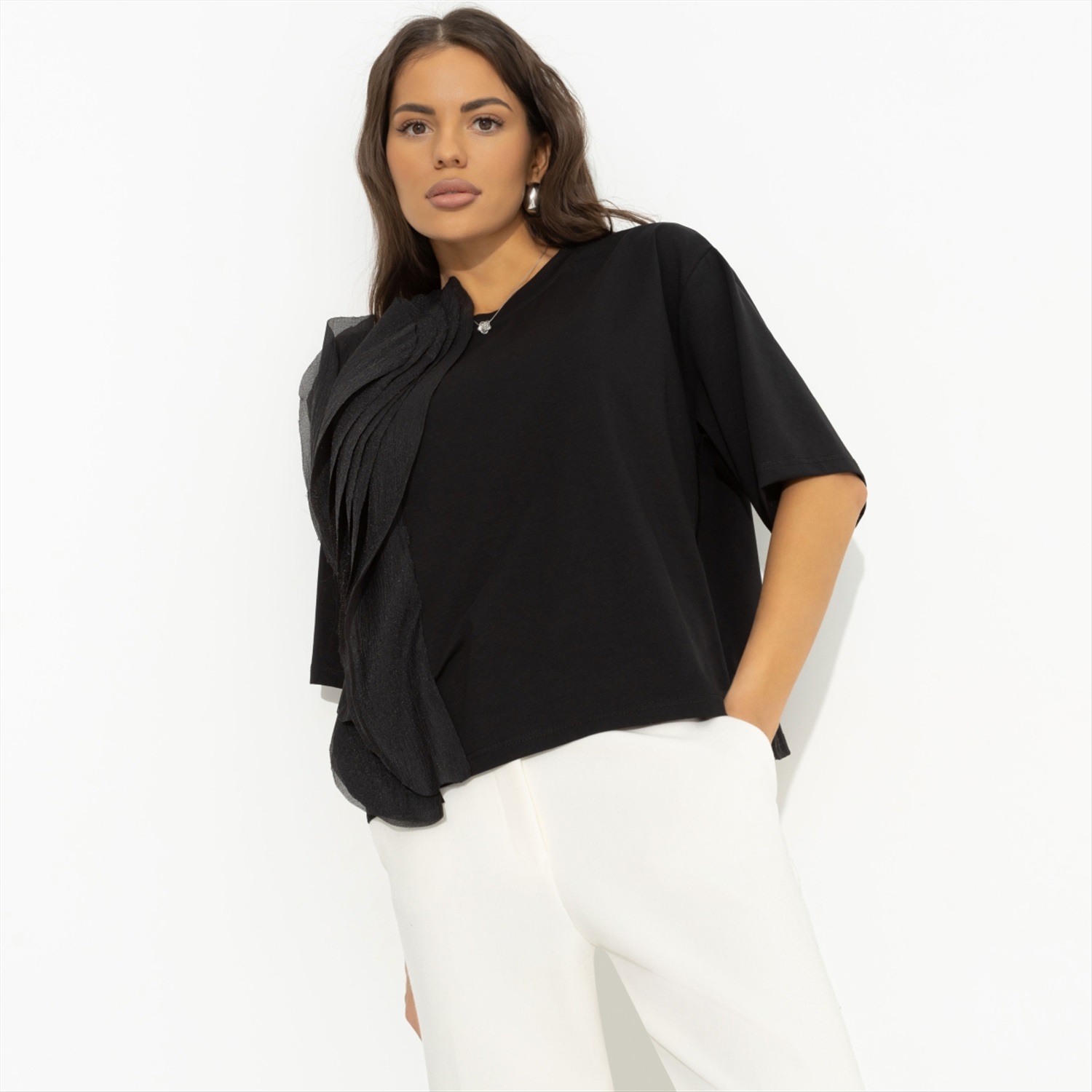 Вечная классика – черная футболка. С утра до вчера, от работы до вечеринки, с подругами или с поклонниками – всегда уместна. Универсальная вещь для насыщенной жизни. Футболка прямого кроя, свободная. Изделие слегка укорочено. Длина рукава до середины руки. Украшено объемным несъёмным декором из органзы в тон. Подойдет до 52 размера. Погрузитесь в мир стиля и комфорта с футболкой свободного кроя «Найду на краю света (dark)». Эта женская футболка, выполненная из высококачественного материала «кулир пенье», станет незаменимой частью вашего гардероба. Черная футболка — это вечная классика, которая подходит для любого случая: от офисных будней до вечерних посиделок с друзьями. Ее универсальность позволяет быть уверенной в своем образе, независимо от того, с кем или где вы находитесь. Просторный фасон и слегка укороченная длина делают эту футболку идеальным выбором для женщин, которые ценят не только стиль, но и удобство. Эта женская футболка оверсайз дарит свободу движений и комфорт в течение всего дня. Декоративный элемент из органзы придает изделию особый шарм и элегантность. Длина рукава до середины руки делает эту модель особенно привлекательной для тех, кто ищет баланс между лаконичностью и изысканностью. Идеально подходит для женщин до 52 размера, эта футболка станет вашим надежным спутником в любых ситуациях. Если вы хотите обновить свой гардероб или ищете идеальный вариант для подарка, покупка этой футболки оптом станет мудрым решением. Не упустите шанс приобрести футболки женские оптом с выгодой и стилем. Эта модель с принтом и объемным несъёмным декором из органзы в тон легко сочетается с различными элементами гардероба, создавая модные образы на каждый день. Изделие подходит как для повседневной носки, так и для особых случаев, когда нужно выглядеть безупречно. Ощутите все достоинства хлопка и органзы, которые обеспечат вам комфорт и уверенность в себе. Покупка футболок женских больших размеров оптом — это не только экономия, но и возможность всегда иметь под рукой стильную и практичную одежду для любого случая. Комментарии к товару