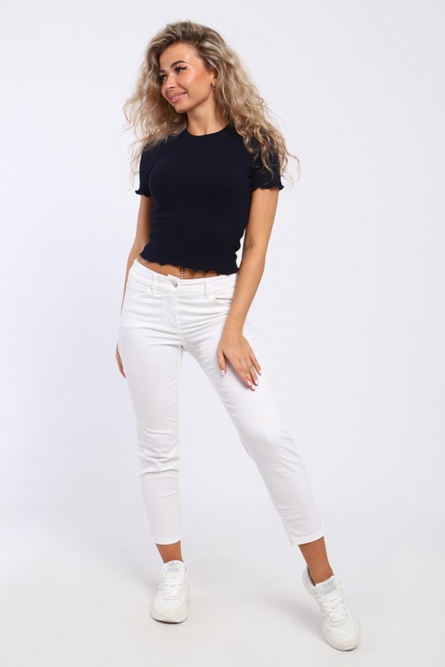 Молодежный вариант прилегающего топа с коротким рукавом и круглой горловиной с оптимальной длиной переда и спинки, из мягкой и эластичной рибаны. Низ рукава и низ изделия обработаны под краевку. На фото модель представлена в 44 размере. На спинке может быть вертикальный шов.