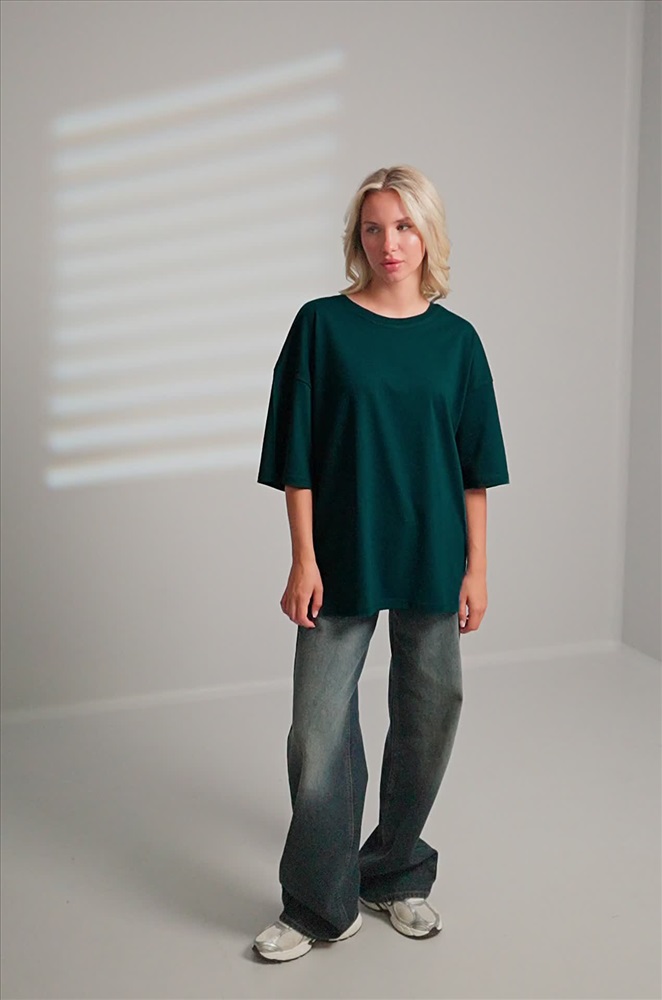 Преимущества: — натуральный 100% хлопок — комфорт и воздухопроницаемость; — мягкий хлопковый трикотаж кулирная гладь (плотность 160 г/м²); — крой оверсайз добавляет расслабленности; — плоские швы не ощущаются во время активного дня; — удобная круглая горловина; — однотонная футболка цвета морской волны станет классным акцентом в повседневном образе. Трикотажная темно-бирюзовая футболка для женщин отлично подойдёт для образов в уличном стиле. Модель Юля, рост 170 см, параметры 89-67-93 см. На ней размер 52-54.