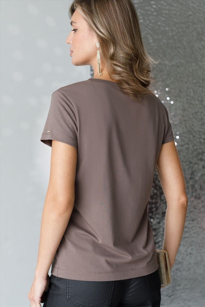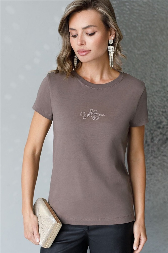 Стильная базовая футболка кофейного цвета с серебристым принтом пайетками выполнена из плотного хлопка с эластаном для комфортной посадки на любую фигуру. Прямая футболка классического кроя с круглым вырезом, прекрасно подходит для разных типов фигуры, в том числе и на большие размеры. Мягкость хлопка вместе с небольшой долей эластана гарантирует идеальную посадку и свободу движений. Легкая натуральная дышащая ткань премиального качества делает футболку с коротким рукавом идеальным вариантом для повседневной носки дома, на работу или офис. Однотонная футболка дополнена авторским аккуратным принтом, который придает праздничный и элегантный вид без лишней вычурности. Блестящий принт аккуратно украшает, добавляя изысканный акцент и создавая легкий мерцающий эффект. Эта эффектная футболка станет отличным выбором на праздник, подчеркивая образ сияющей и уверенной в себе девушки или женщины. Если вы ищете комфортный и одновременно привлекательный наряд для особых моментов, эта футболка станет надежным решением,