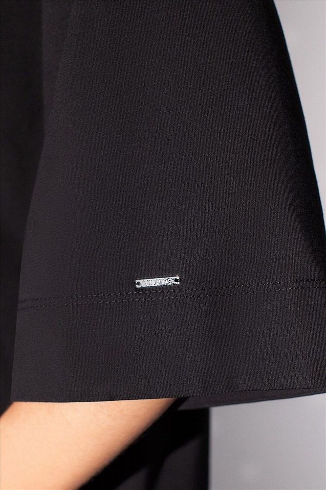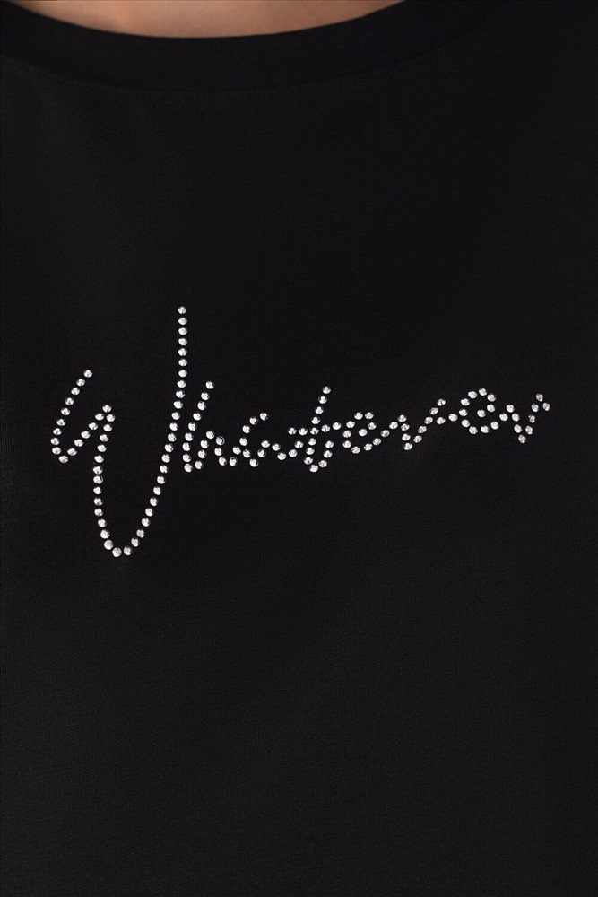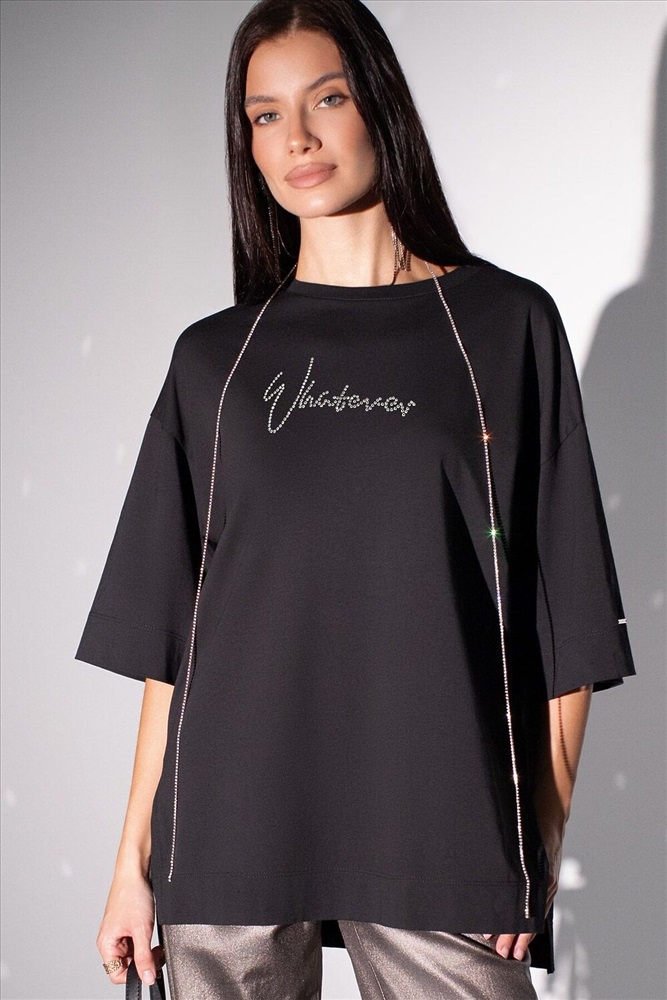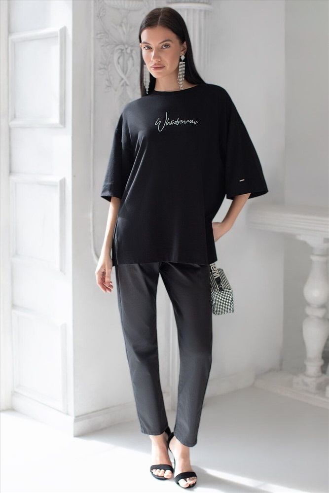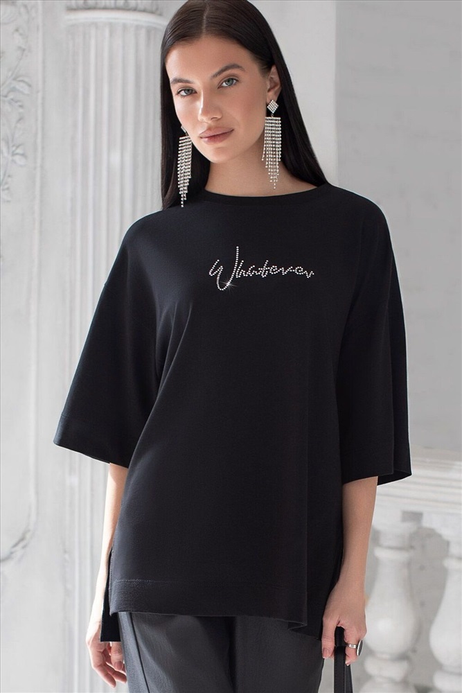 ID товара: 1214165 Состав: 92% Хлопок, 8% Полиуретан Сезон: Демисезон Длина: Средняя Фасон: Свободный Рукав: Короткие Вырез горловины: Округлый Рисунок: Надпись Декоративные элементы: Принт Основная ткань: Хлопок Стиль: Повседневный Страна бренда: Россия Страна производства: Китай Оверсайз футболка черного цвета из премиального хлопка с добавлением эластана создана для комфорта и стиля каждый день. Натуральный материал приятный к телу, дышащая ткань хорошо держит форму и подходит для повседневной носки дома, в офисе или на прогулке. Классический свободный крой, удлиненный прямой силуэт и свободная посадка делают эту базовую футболку универсальным решением для любой фигуры и роста, включая плюс сайз размеры и беременных девушек, отлично скроет животик. Широкие рукава держат форму и подойдут на полные руки. Нарядная футболка украшена авторским принтом в виде надписи серебристыми стразами, которые создают красивый мерцающий эффект. Перевод надписи Whatever - Что бы ни... Такой акцент делает модель уместной как для особых случаев, так и для ежедневных образов. Такая эффектная длинная футболка станет универсальным дополнением гардероба, позволяя создавать разнообразные образы с акцентом на современный стиль и утонченность деталей. Благодаря стильному дизайну с боковыми разрезами эта футбол Комментарии к товару