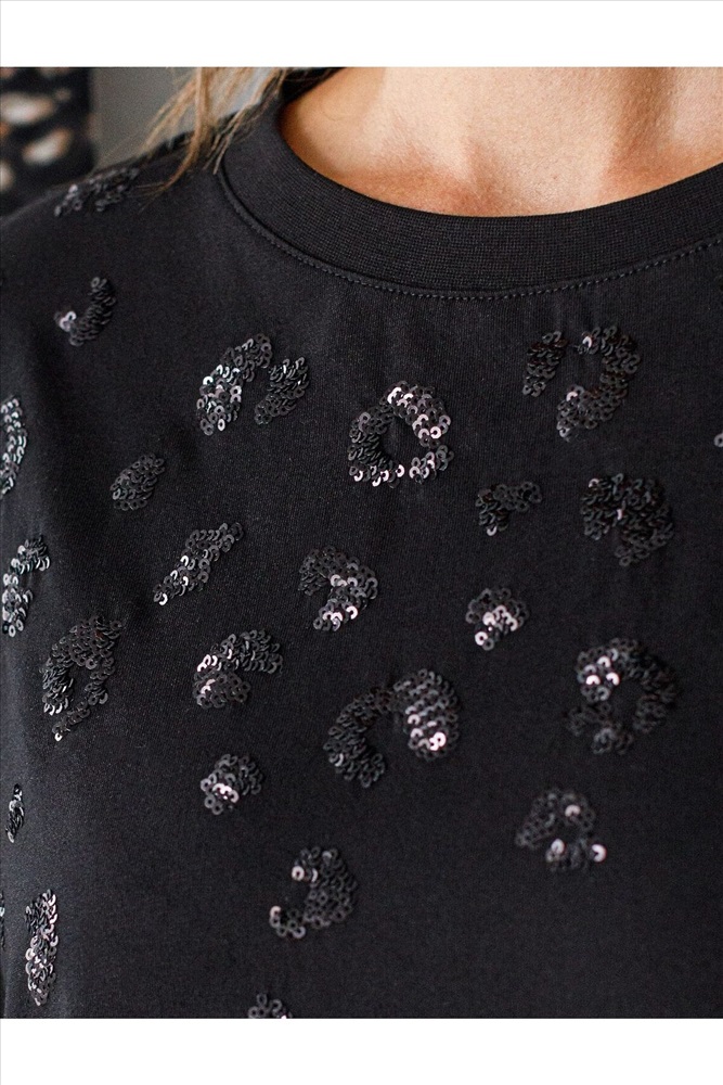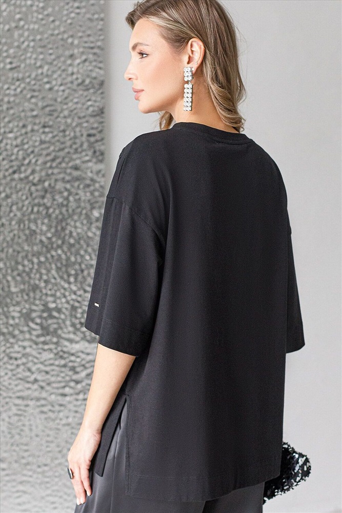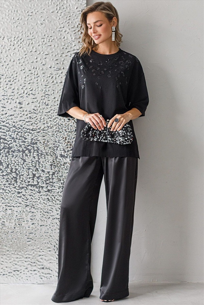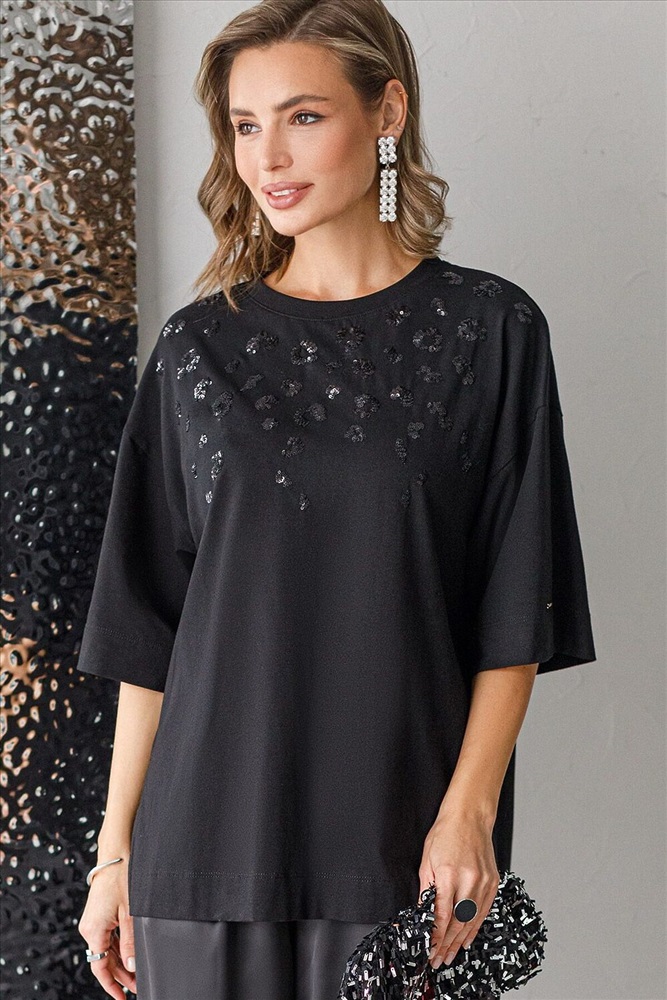 Оверсайз футболка черного цвета из премиального хлопка с добавлением эластана создана для комфорта и стиля каждый день. Натуральный материал приятный к телу, дышащая ткань хорошо держит форму и подходит для повседневной носки дома, в офисе или на прогулке. Классический свободный крой, удлиненный прямой силуэт и свободная посадка делают эту базовую футболку универсальным решением для любой фигуры и роста, включая плюс сайз размеры и беременных девушек, отлично скроет животик. Широкие рукава держат форму и подойдут на полные руки. Нарядная футболка украшена авторским принтом пайетками. Такой акцент делает модель уместной как для особых случаев, так и для ежедневных образов. Такая эффектная длинная футболка станет универсальным дополнением гардероба, позволяя создавать разнообразные образы с акцентом на современный стиль и утонченность деталей. Благодаря стильному дизайну с боковыми разрезами эта футболка станет идеальным вариантом для создания легких и непринужденных луков.