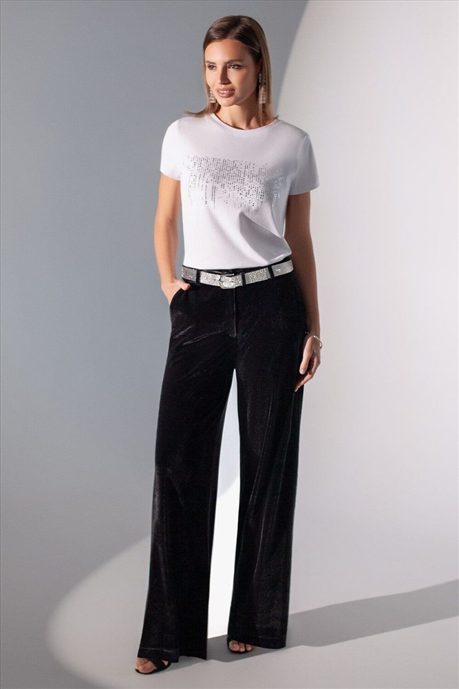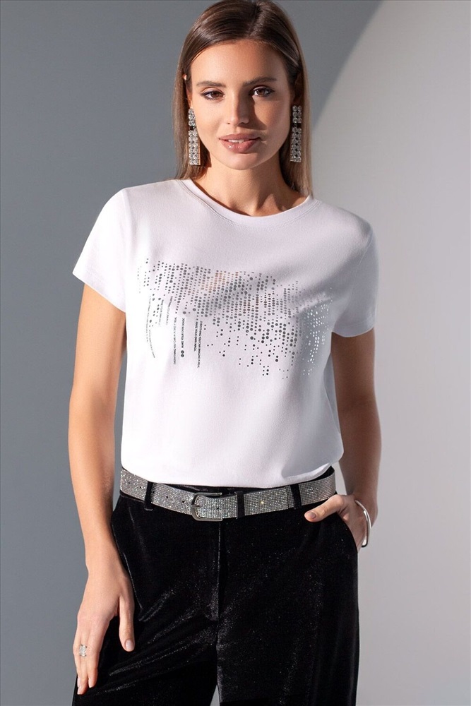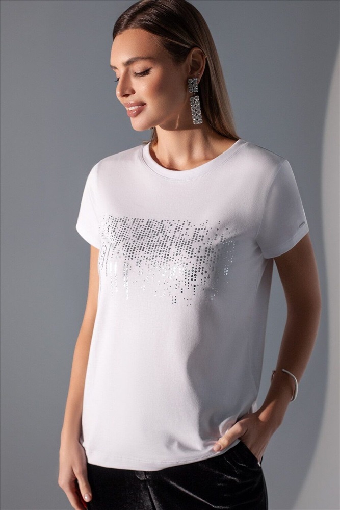Стильная базовая футболка белого цвета с серебристым принтом стразами выполнена из плотного хлопка с эластаном для комфортной посадки на любую фигуру. Прямая футболка классического кроя с круглым вырезом, прекрасно подходит для разных типов фигуры, в том числе и на большие размеры. Мягкость хлопка вместе с небольшой долей эластана гарантирует идеальную посадку и свободу движений. Легкая натуральная дышащая ткань премиального качества делает футболку с коротким рукавом идеальным вариантом для повседневной носки дома, на работу или офис. Однотонная футболка дополнена авторским аккуратным принтом, который придает праздничный и элегантный вид без лишней вычурности. Блестящий принт в виде дождика из страз аккуратно украшает, добавляя изысканный акцент и создавая легкий мерцающий эффект. Эта эффектная футболка станет отличным выбором на праздник, подчеркивая образ сияющей и уверенной в себе девушки или женщины. Если вы ищете комфортный и одновременно привлекательный наряд для особых моментов, эта футболка стане