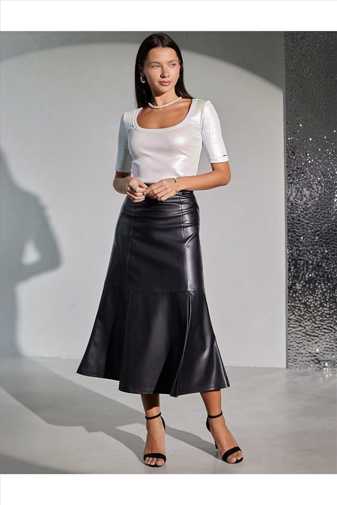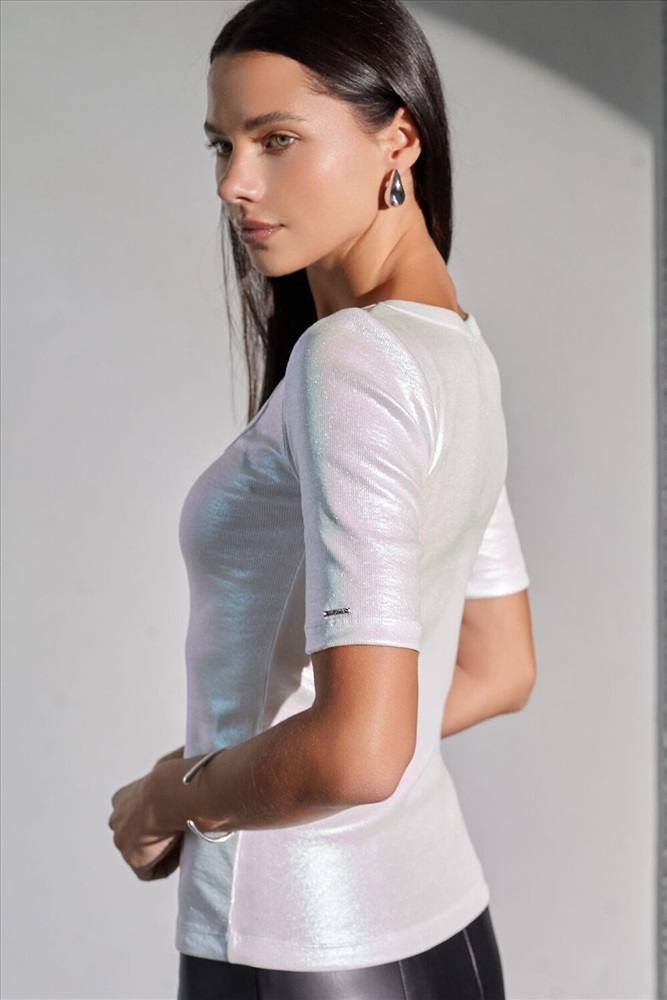 Стильная футболка перламутрового цвета с U вырезом выполнена из премиального хлопка с добавлением эластана. Эффектное матовое покрытие металлик придает футболке изысканный блеск. Чуть удлиненные рукава и глубокий круглый вырез, открывающий область декольте, добавляют женственность и элегантность образу. Мелкий рубчик визуально вытягивает силуэт, за счет эластана в составе материал прекрасно тянется и садится на любую фигуру, в том числе большие размеры. Ткань износостойкая, сохраняет свой превоначальный вид даже после многочисленных стирок, отличается мягкостью и приятными тактильными ощущениями, такой материал не раздражает кожу, дарит ощущение уюта даже при длительном ношении, а воздухопроницаемость позволяет коже свободно дышать. Повседневная футболка универсальна: она сочетается с джинсами, юбками или строгими брюками — легко создать как деловой образ для офиса, так и наряд для вечеринки или ужина вне дома. Матовое покрытие создает благородный блеск без лишней яркости, благодаря чему футболка смотрит