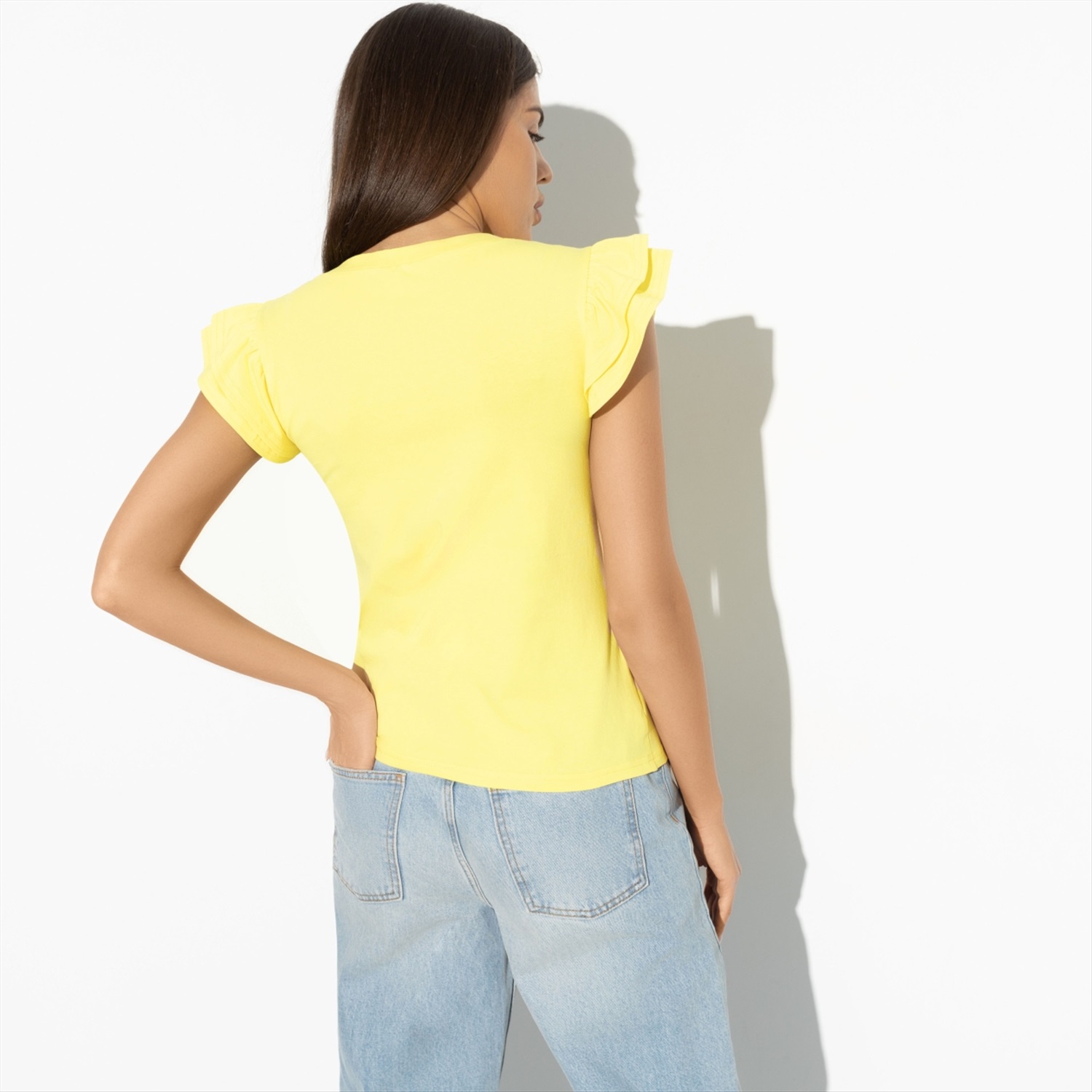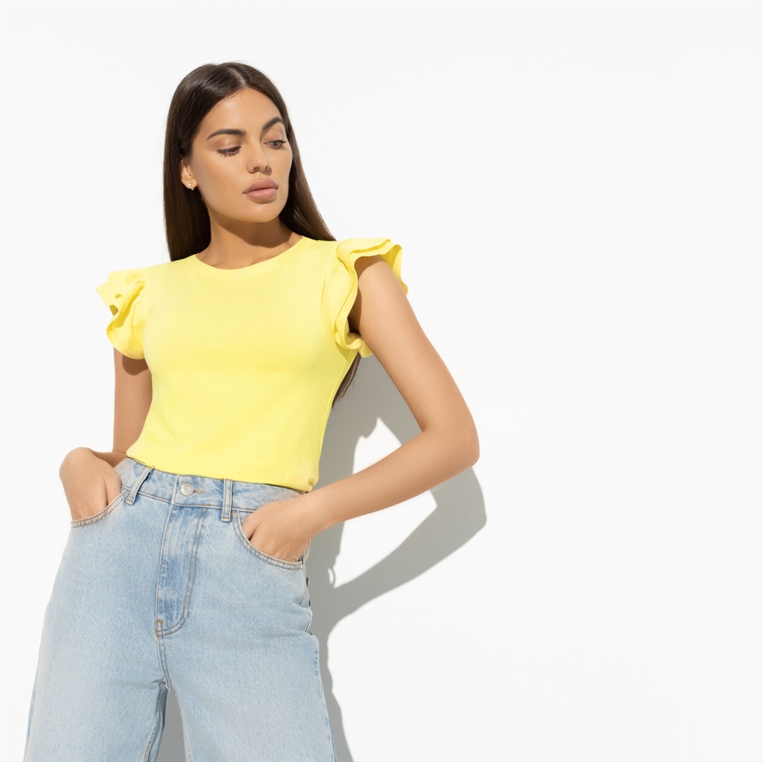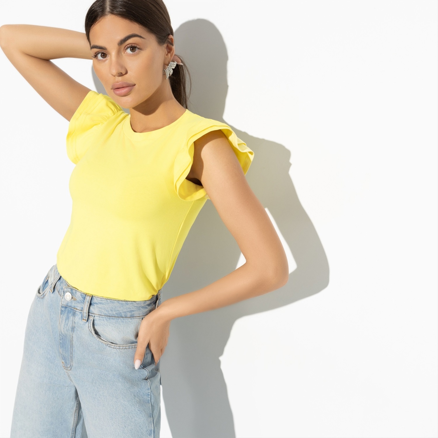 Завоевать сердца многих? Легко! В футболке пастельно-желтого цвета. Воланы на плечах, классическая посадка делают футболку оружием массового ми-ми-мишного поражения.