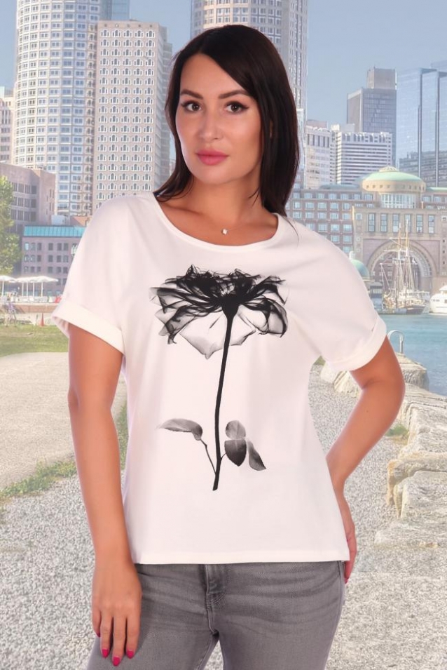 Нежная, воздушная розочка с лепестками подобно вуали придает этой футболке оригинальность и красоту. Цельнокроенный рукав с подворотом, горловина обработана двойным кантом, низ подгибка.