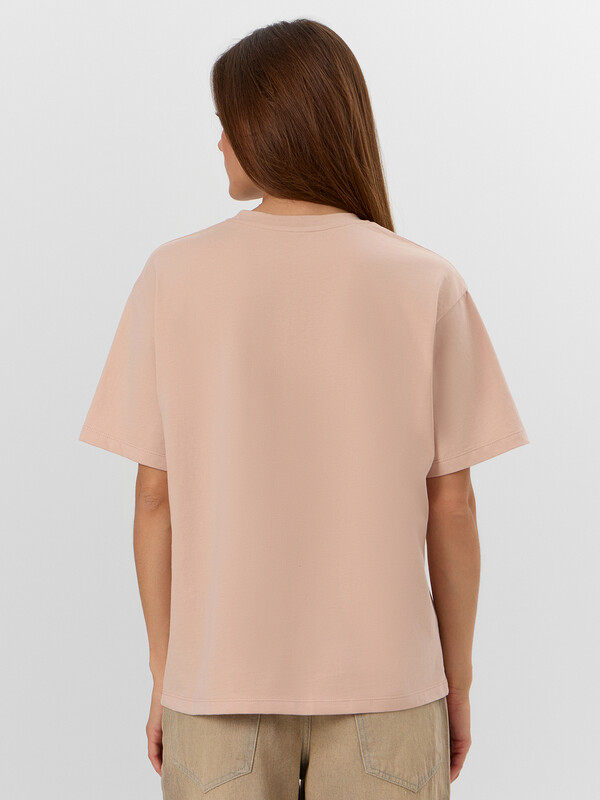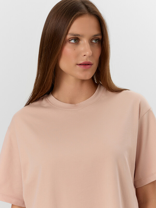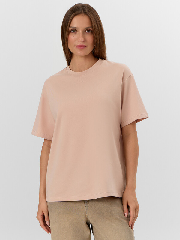 Элегантность в простоте — женская футболка для вашего базового гардероба. Модель свободного силуэта станет основой для множества стильных образов. Она выполнена из мягкой и дышащей хлопковой кулирки, что делает ее идеальным выбором для повседневного ношения. Круглая горловина придает аккуратный вид, а спущенная линия плеча и углубленная пройма обеспечивают свободу движений. Широкие рукава, длиной чуть выше локтя, придают изделию современный и непринужденный вид. Эта футболка идеально сочетается с джинсами, шортами или юбкой, позволяя вам создавать как повседневные, так и более элегантные образы. Стильная удобная и универсальная — незаменимый элемент вашего гардероба!