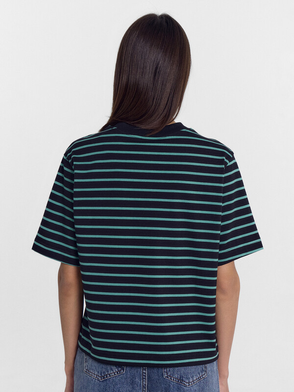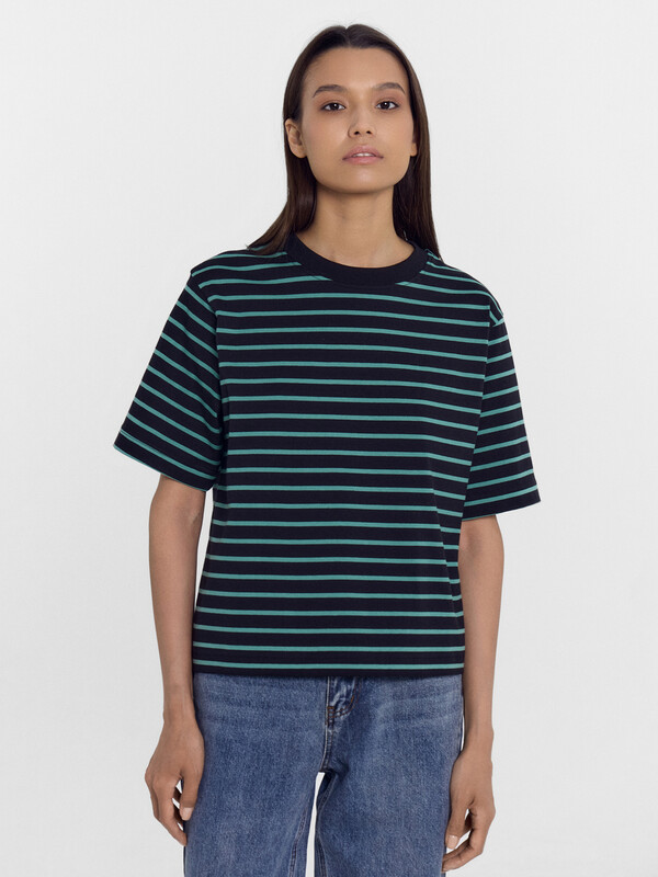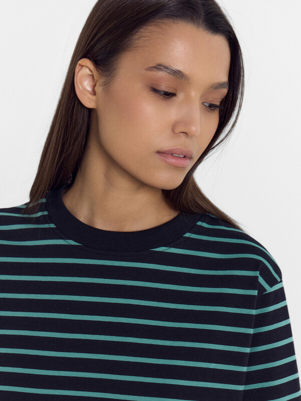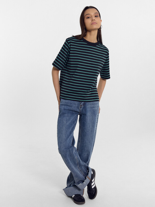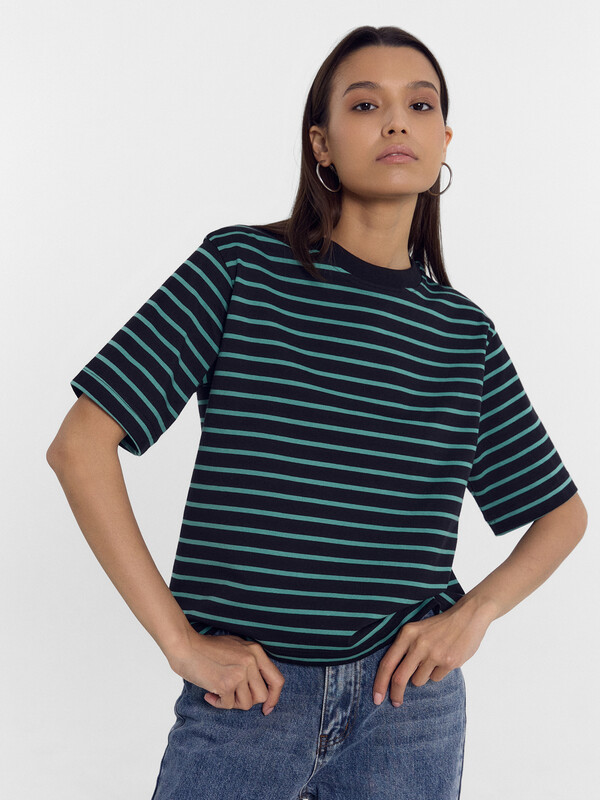 Нижние срезы футболки и рукавов обработаны швом вподгибку.