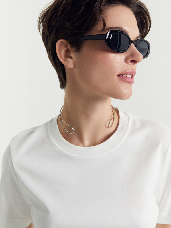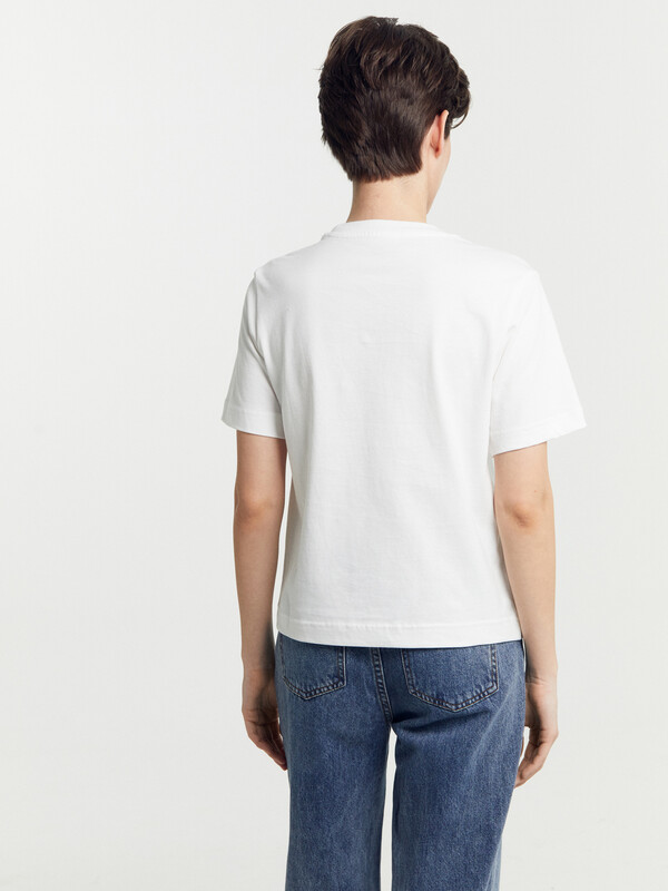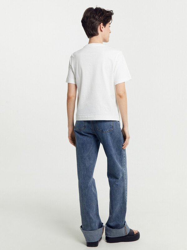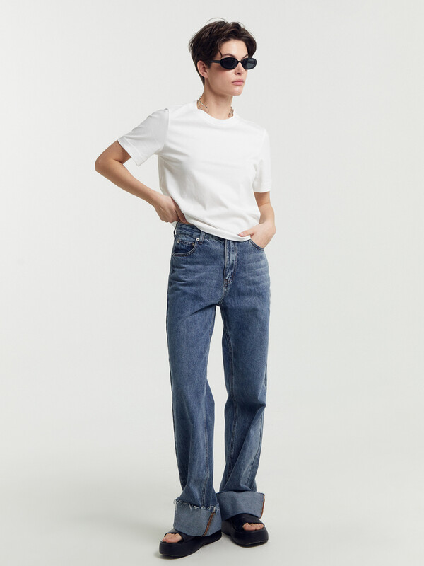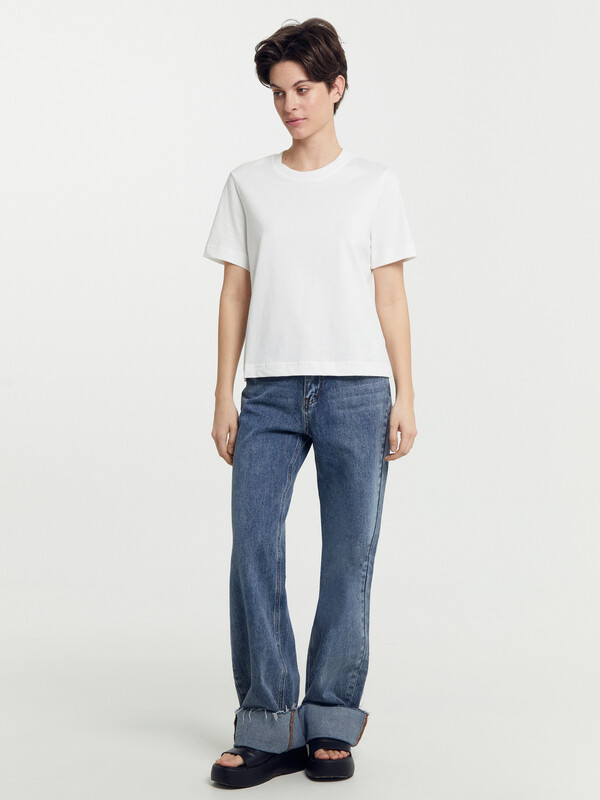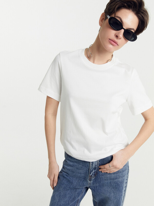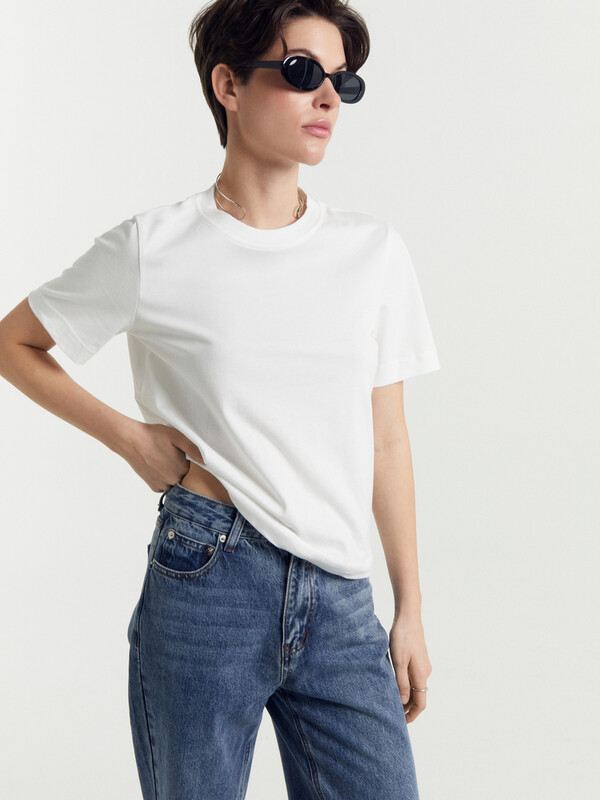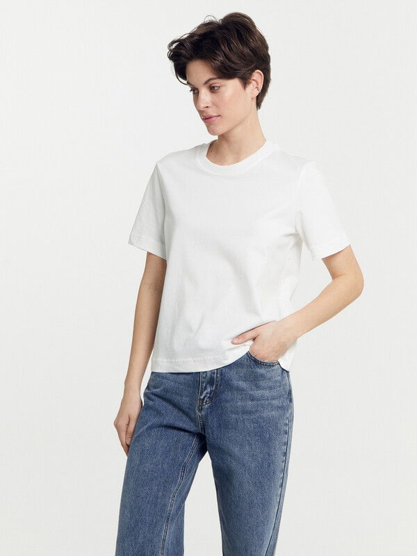Футболка прямого силуэта из трикотажного полотна кулирка. Горловина круглой формы, широкая обтачка из рибаны.
