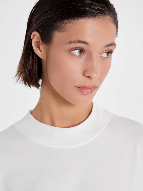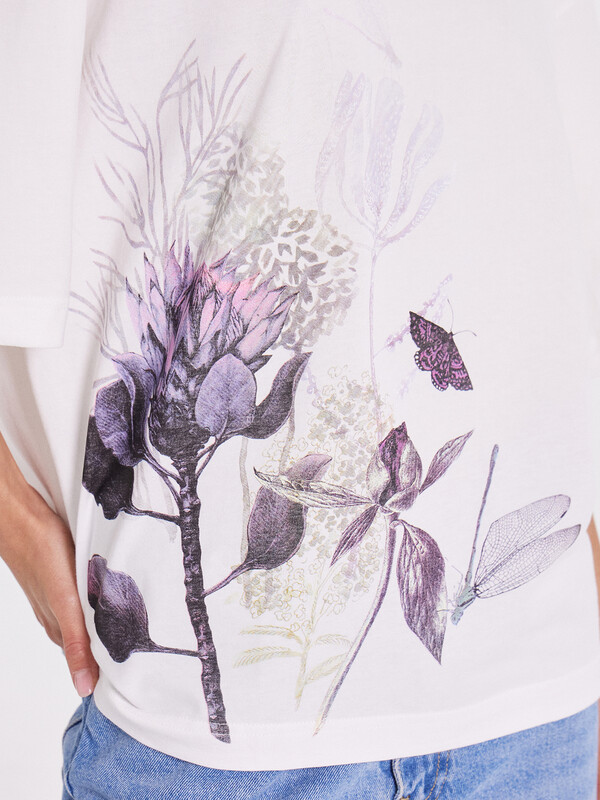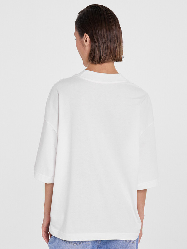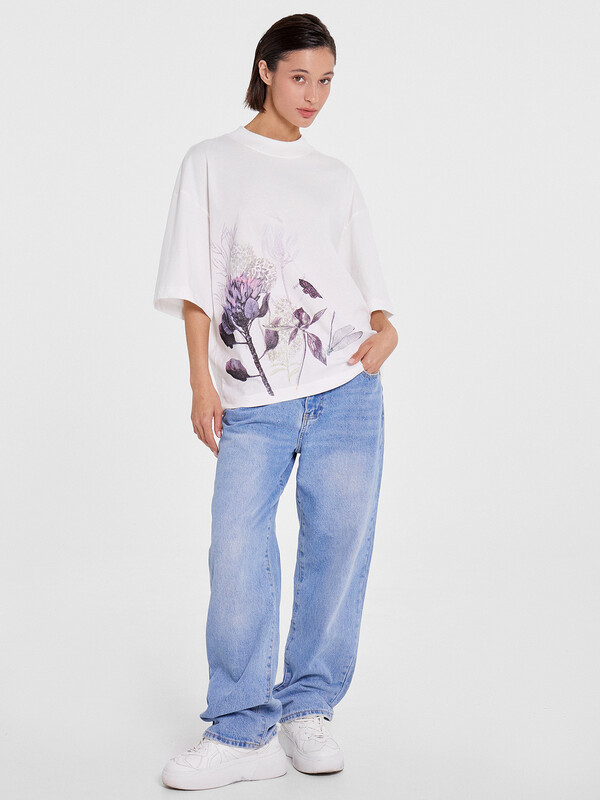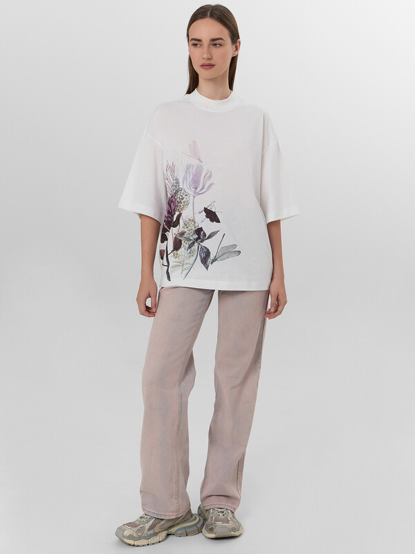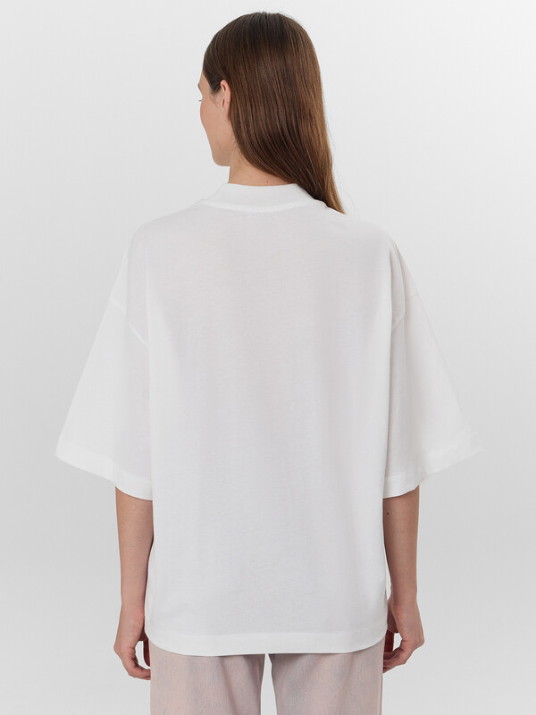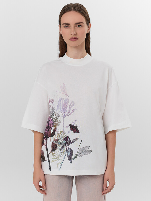 Футболка женская свободного силуэта из трикотажного кулирного пототна. Горловина круглой формы, с широкой обтачкой из рибаны. Плечо спущено, пройма углублена. Рукав втачной, длиной по локоть. Подгибка низа и рукавов широкая.