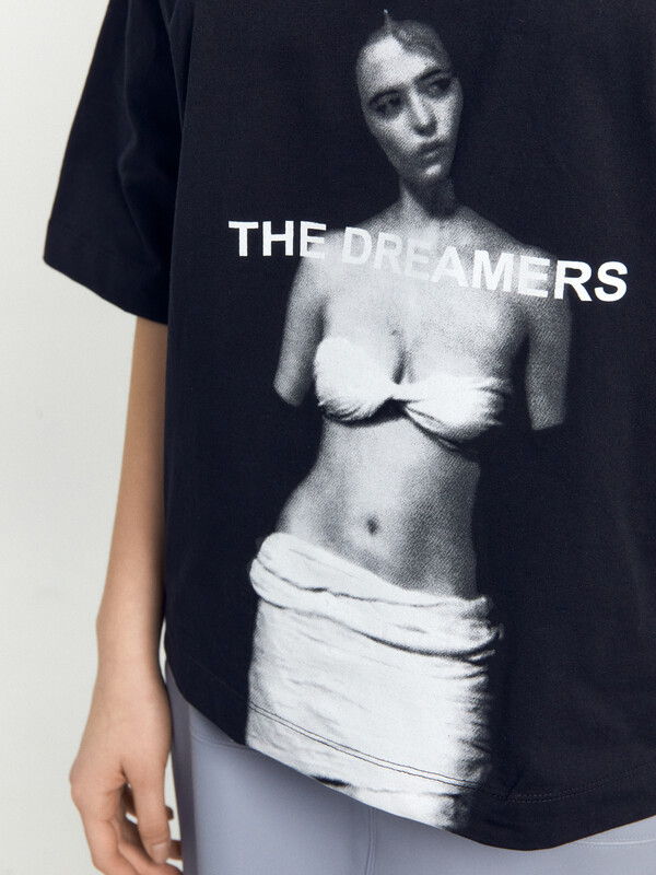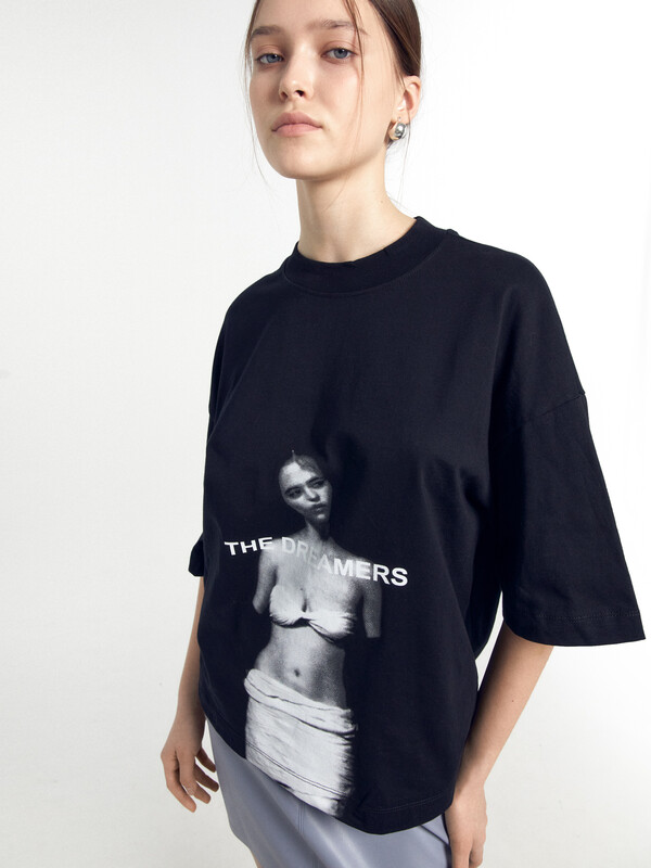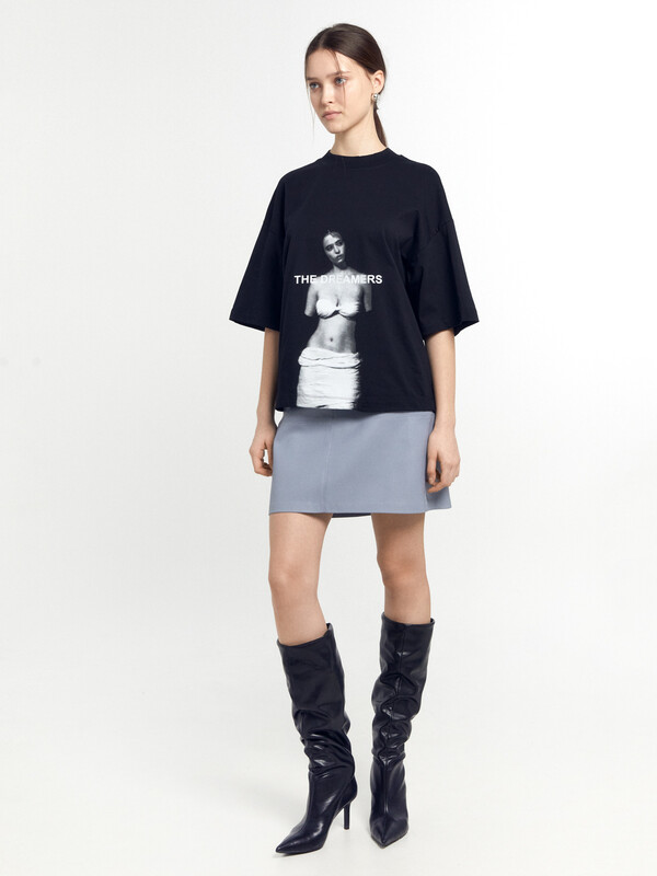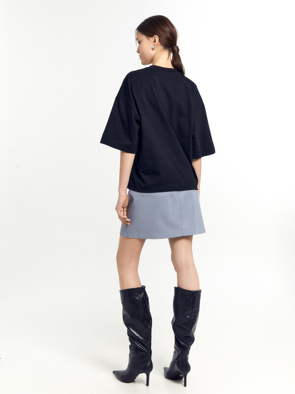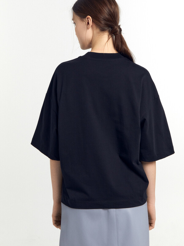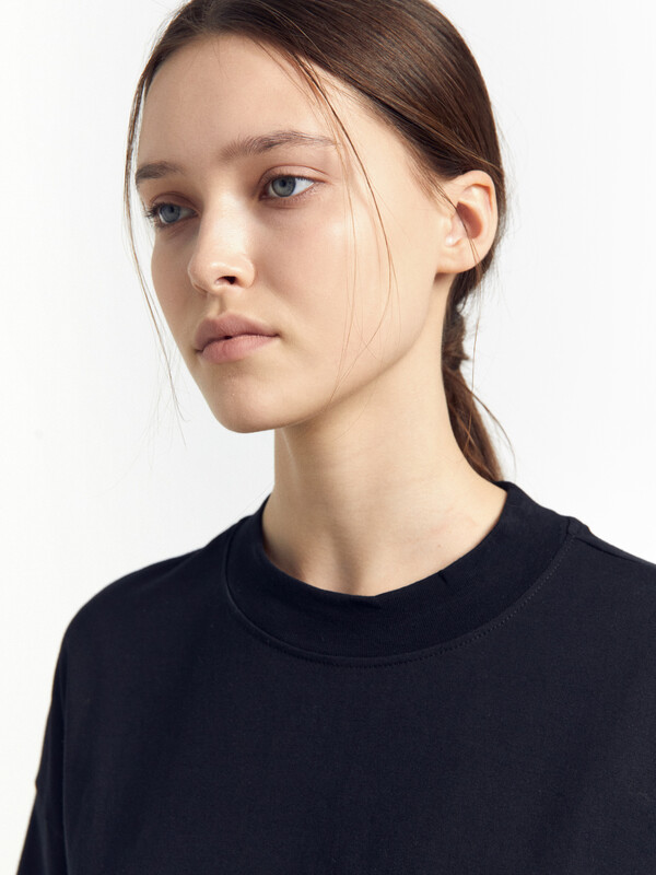 Футболка женская свободного силуэта из трикотажного кулирного пототна. Горловина круглой формы, с широкой обтачкой из рибаны. Плечо спущено, пройма углублена. Рукав втачной, длиной по локоть. Подгибка низа и рукавов широкая.