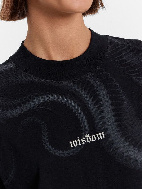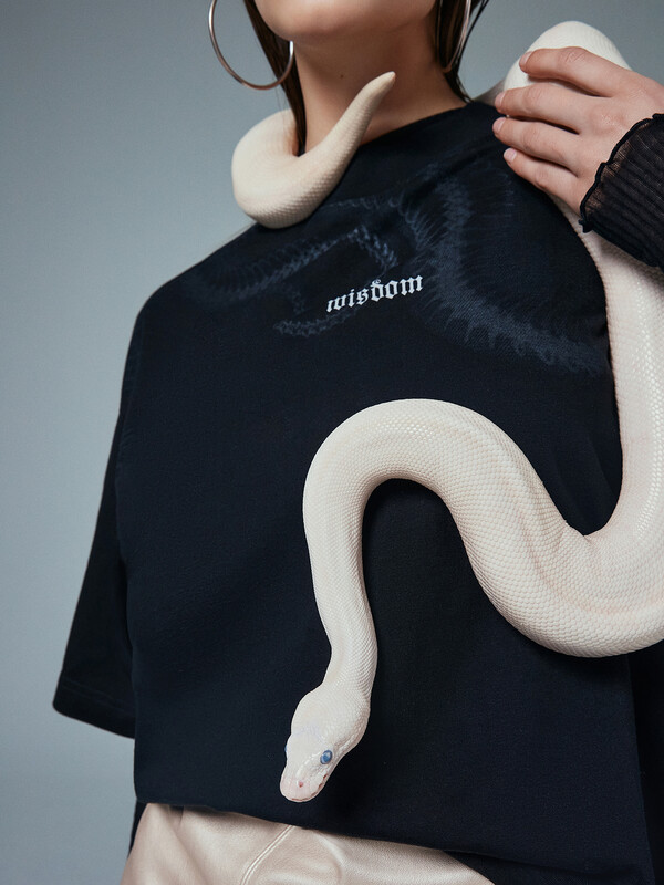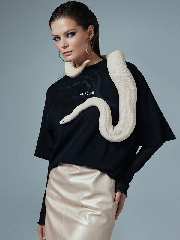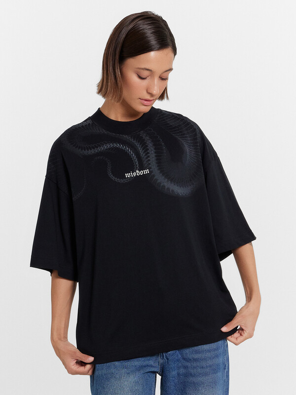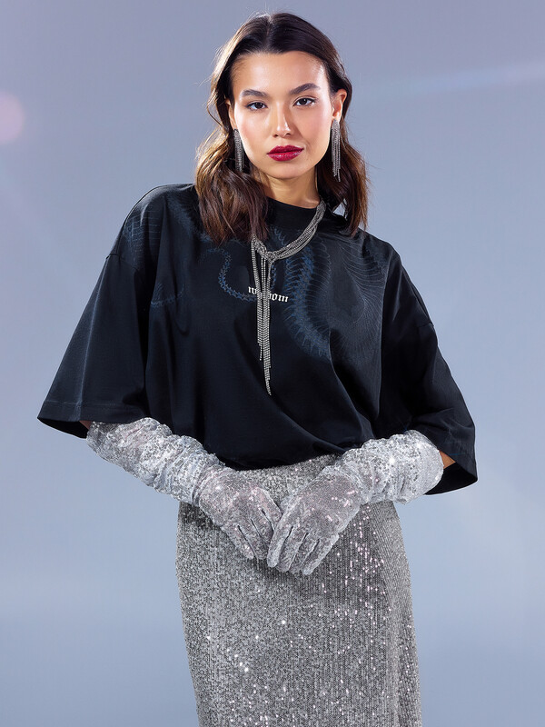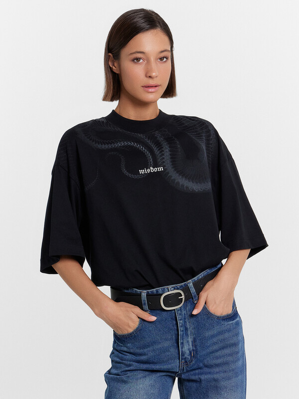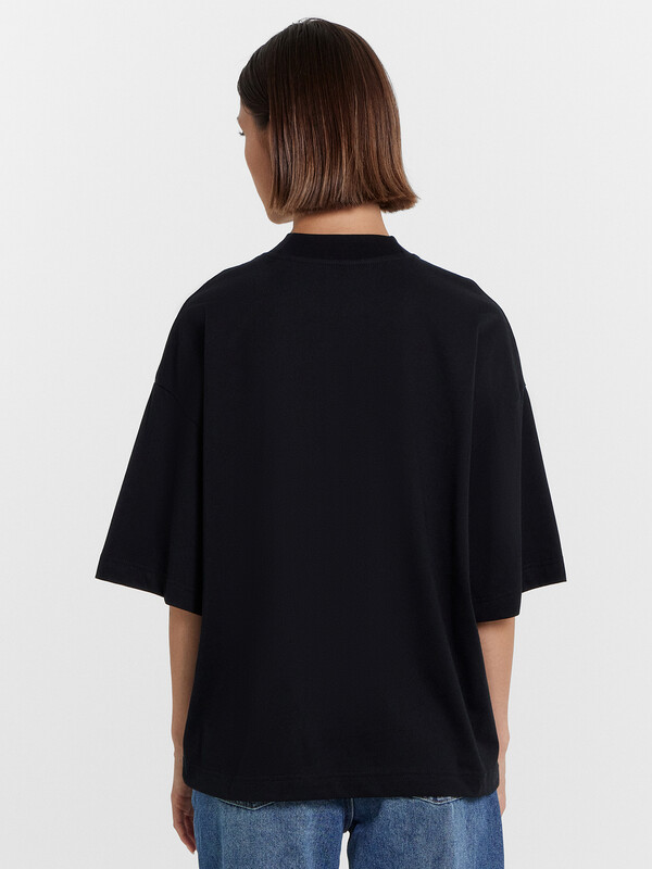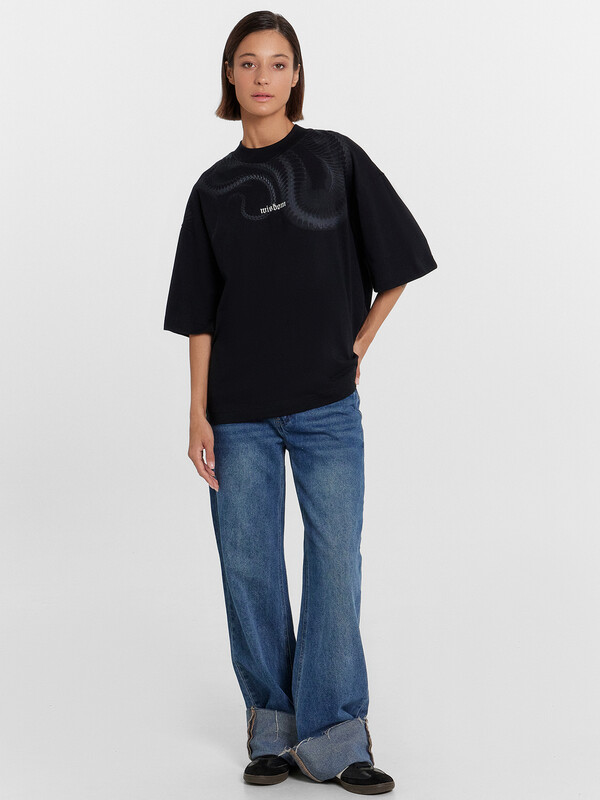 Футболка женская свободного силуэта из трикотажного кулирного пототна. Горловина круглой формы, с широкой обтачкой из рибаны. Плечо спущено, пройма углублена. Рукав втачной, длиной по локоть. Подгибка низа и рукавов широкая.