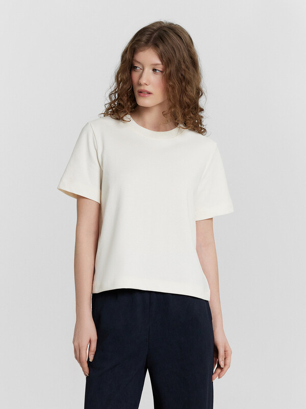 Укороченная женская футболка прямого силуэта из трикотажного материала интерлок – прекрасный выбор для повседневного и стильного образа. Модель с круглой горловиной добавляет элегантности и завершённости. Натуральный материал обеспечивает комфорт и мягкость, позволяя вам чувствовать себя уютно в течение всего дня. Этот предмет гардероба легко сочетать с различными элементами одежды, создавая стильные и индивидуальные образы на любой случай.