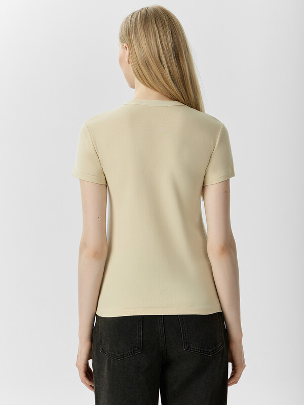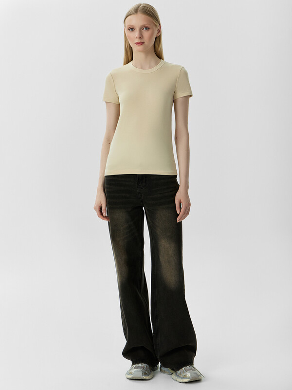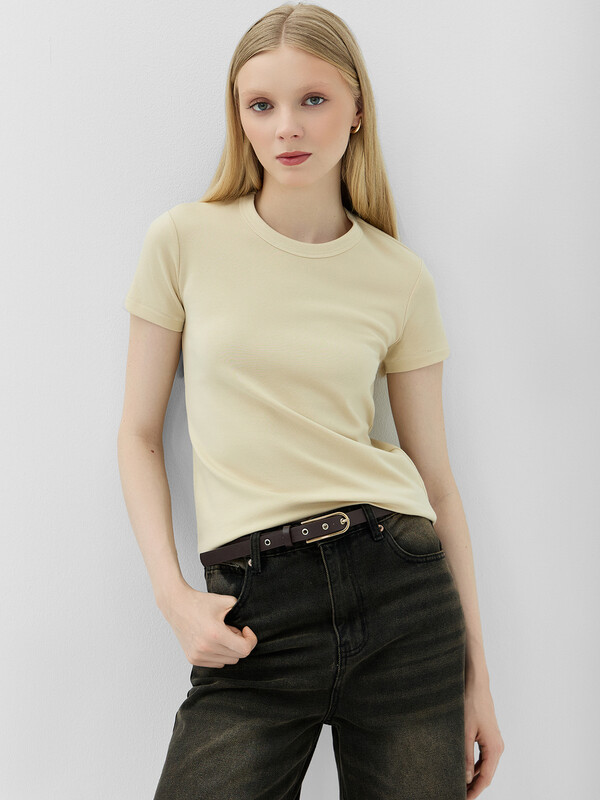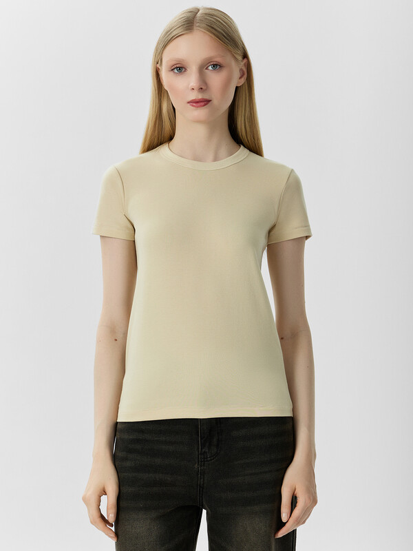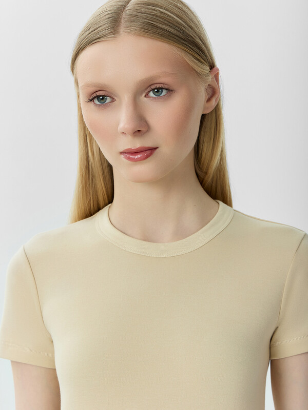Футболка прямого силуэта. Горловина округлой формы обработана бейкой в 3 сложения из рибаны. Рукава втачные, корткие. Нижние срезы футболки и рукавов обработаны швом вподгибку. 52% хлопок; 48% полиэстер Комментарии к товару