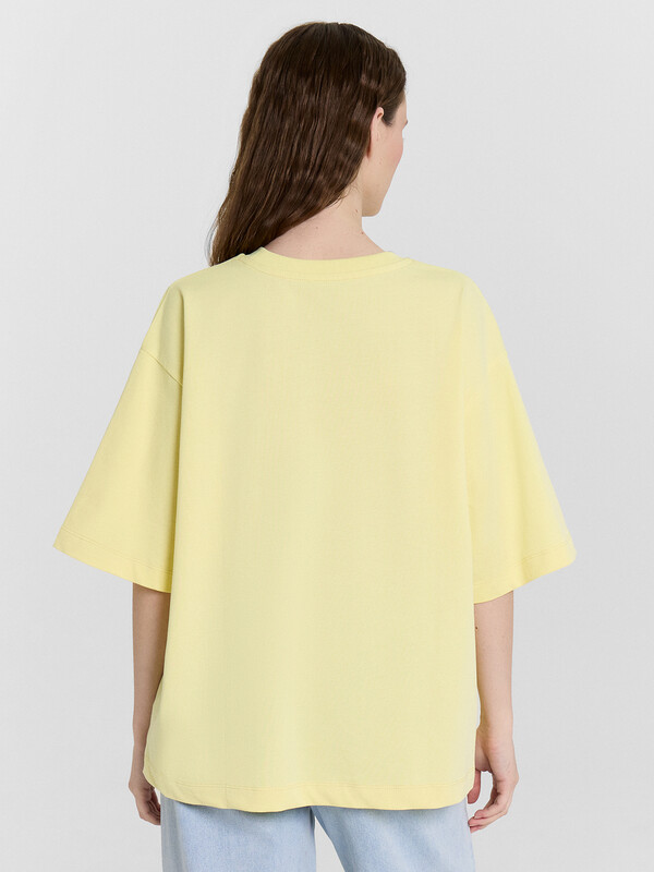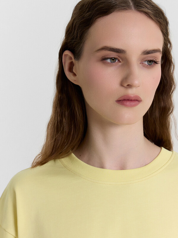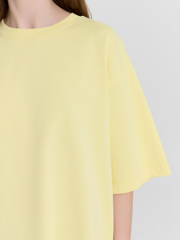 Горловина округлой формы обработана обтачкой из рибаны. Шов втачивания обтачки по спинке закрыт окантован поперечной бейкой из основного полотна. Рукава втачные, короткие. Линия плеча спущена. Нижние срезы футболки и рукавов обработаны швом вподгибку.