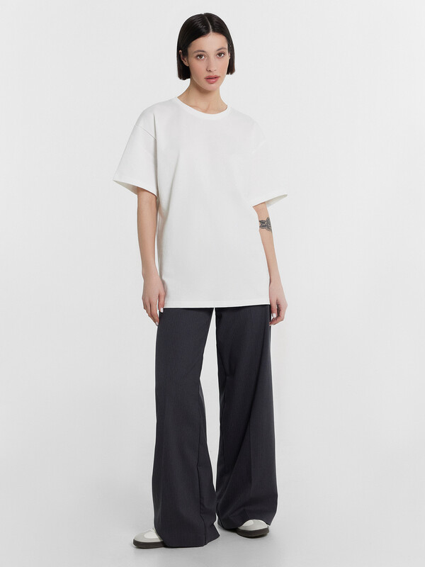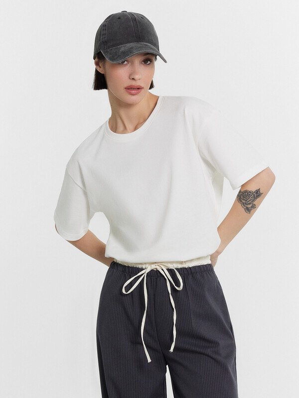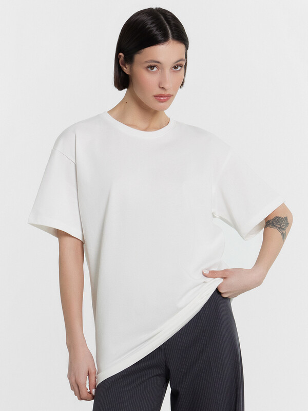 Базовая футболка от Mark Formelle – это действительно удачное вложение в женский гардероб. Круглая форма горловины и короткие рукава придают ей классический и универсальный вид. Спущенная линия плеча обеспечивает дополнительный комфорт и стиль. Выполненная из хлопковой кулирки, эта футболка гарантирует мягкость и воздухопроницаемость, делая ее идеальным выбором для повседневного ношения. Она легко сочетается с различными элементами гардероба, создавая множество стильных образов. Отличный выбор для базового гардероба!