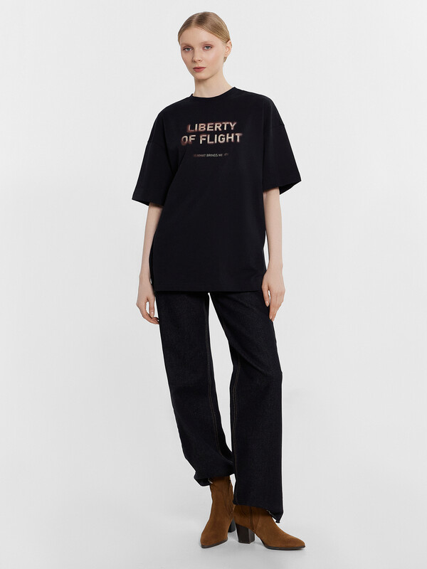 Производитель: Mark Formelle Футболка силуэта оверсайз из трикотажного полотна кулирка. Горловина круглой формы, обтачка горловины из рибаны. Шов горловины спинки закрыт бейкой из основного полотна.