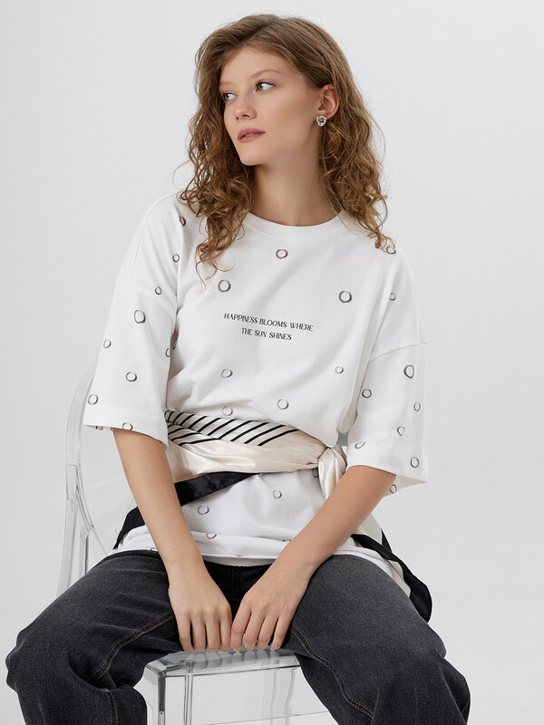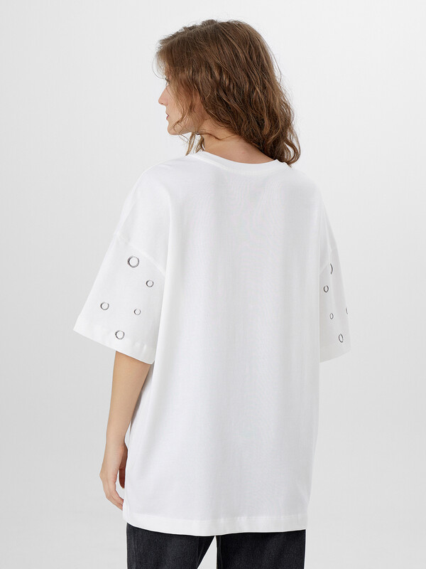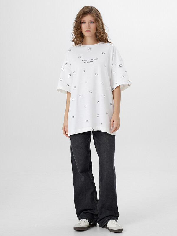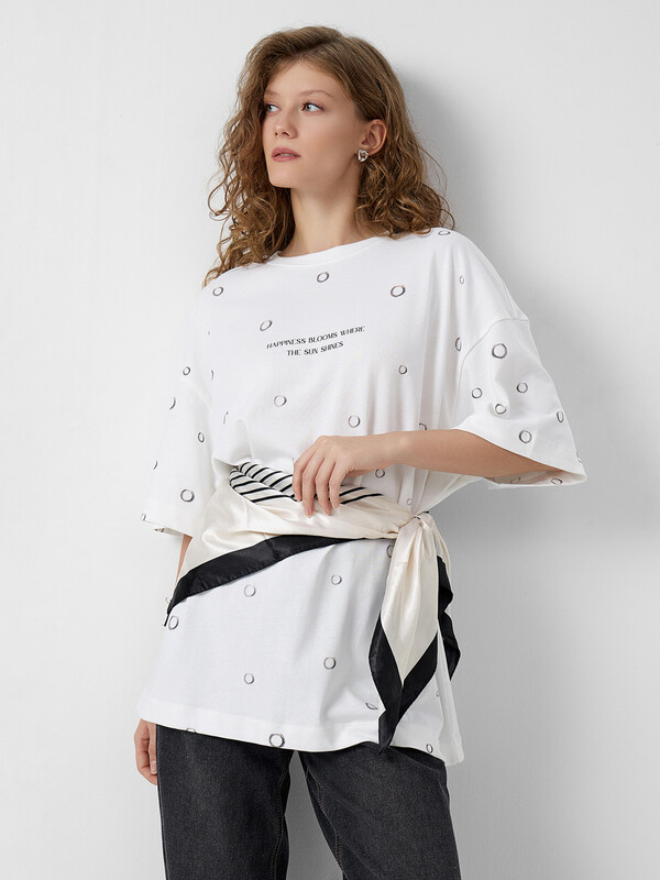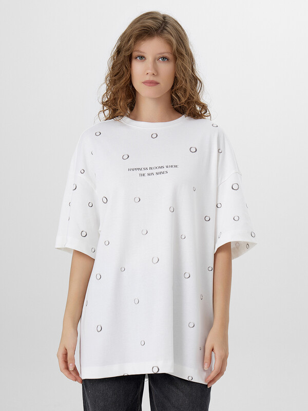 Производитель: Mark Formelle Женская футболка силуэта оверсайз из трикотажной хлопковой кулирки - это комфортная и стильная модель, идеально подходящая для повседневного гардероба. Удлиненный крой и свободная посадка создают расслабленный образ, а спущенное плечо и углубленная пройма подчеркивают актуальность силуэта. Круглая горловина с обтачкой из рибаны сохраняет форму и придает аккуратный вид, а широкие рукава длиной чуть выше локтя добавляют объема и свободы движений. Натуральный хлопок в составе обеспечивает мягкость, воздухопроницаемость и комфорт даже в жаркую погоду. Такая футболка легко сочетается с джинсами, велосипедками, шортами или юбками, позволяя создавать образы в стиле casual, streetwear или спорт-шик.