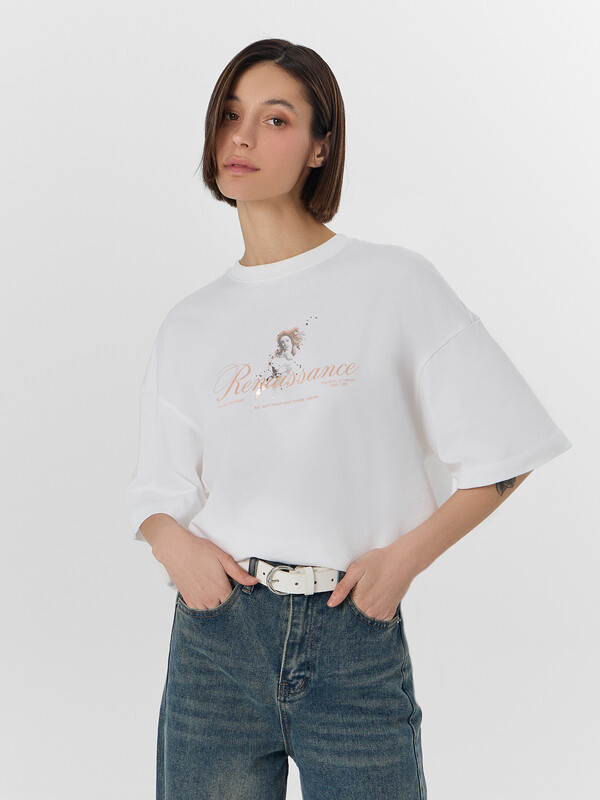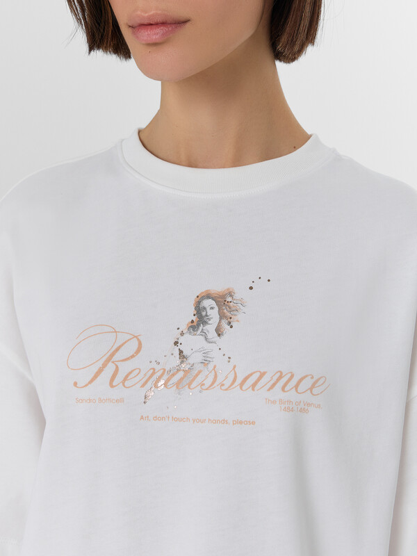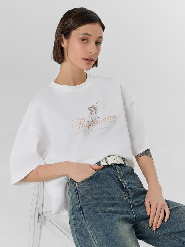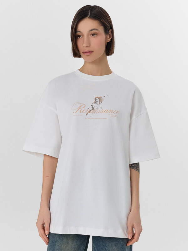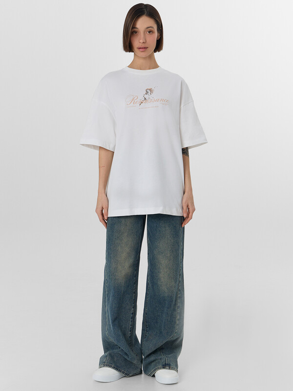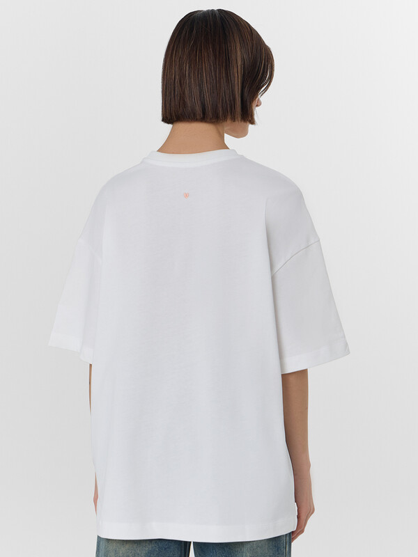 Производитель: Mark Formelle Футболка силуэта оверсайз из трикотажного полотна кулирка. Горловина круглой формы, обтачка горловины из рибаны. Шов горловины спинки закрыт бейкой из основного полотна.