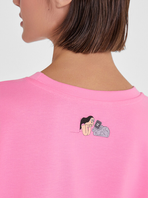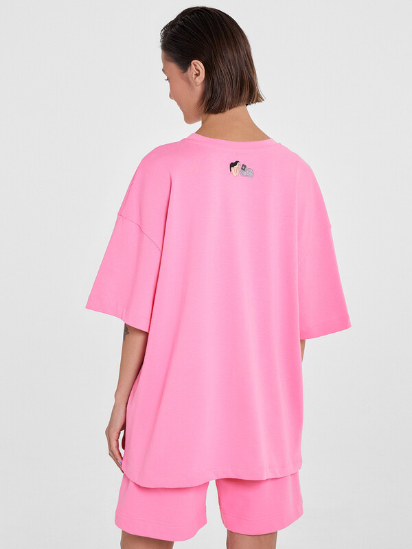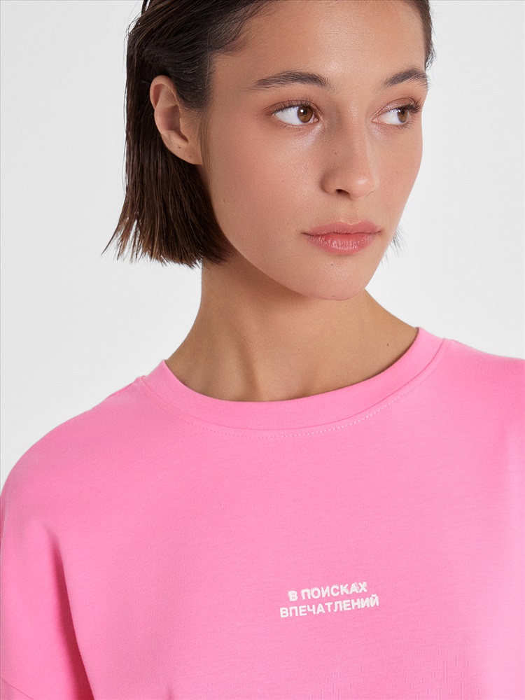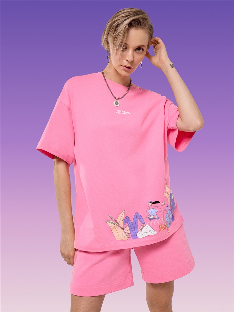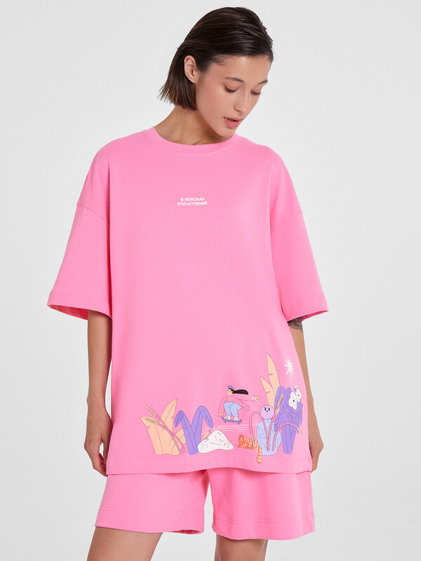 Производитель: Mark Formelle Футболка силуэта оверсайз из трикотажного полотна кулирка. Горловина круглой формы, обтачка горловины из рибаны. Шов горловины спинки закрыт бейкой из основного полотна.