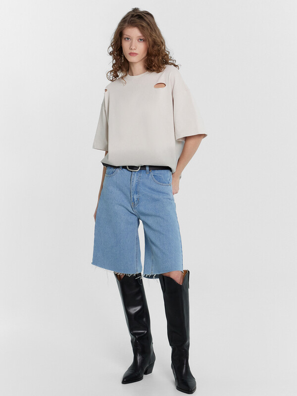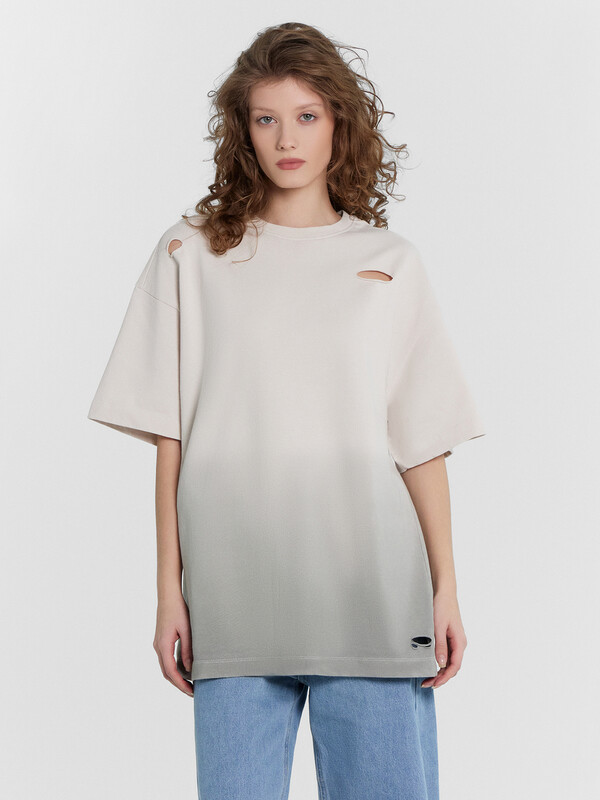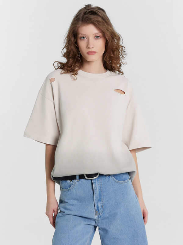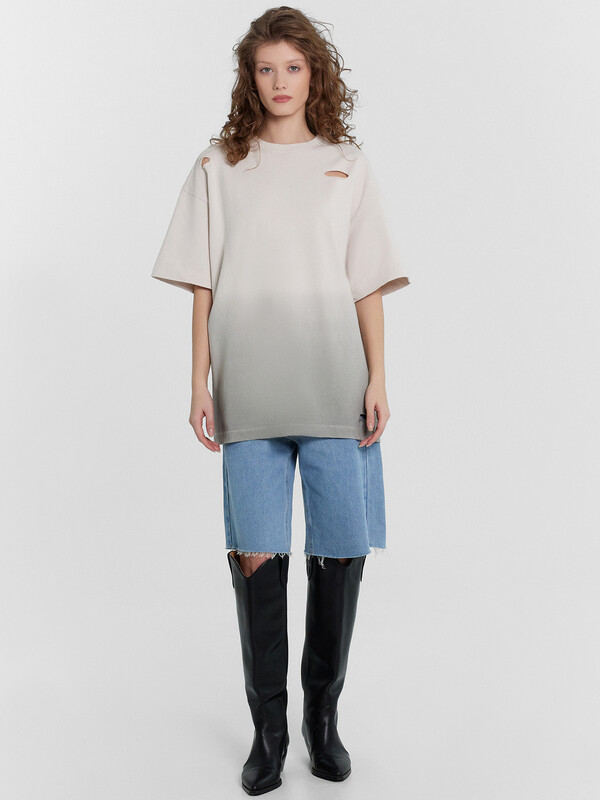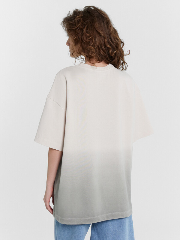 Производитель: Mark Formelle Футболка силуэта оверсайз из трикотажного полотна кулирка. Горловина круглой формы, обтачка горловины из рибаны. Шов горловины спинки закрыт бейкой из основного полотна.