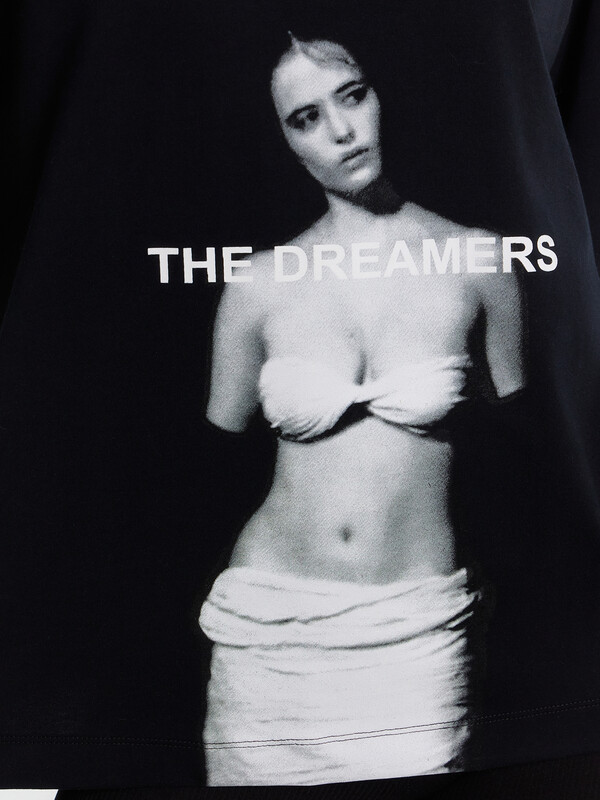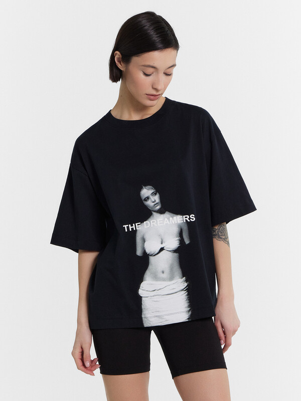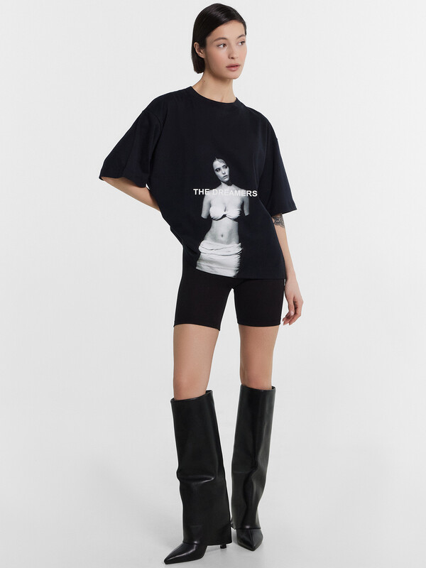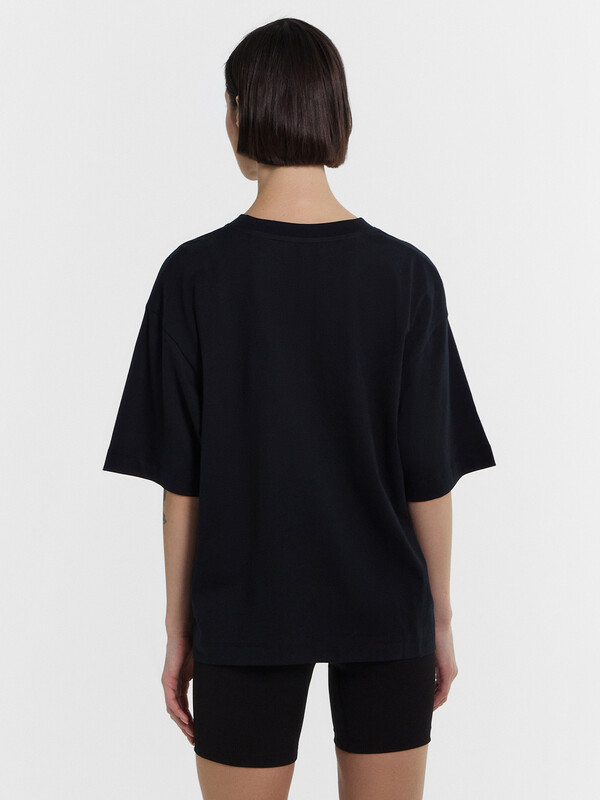 Нижние срезы футболки и рукавов обработаны швом вподгибку.