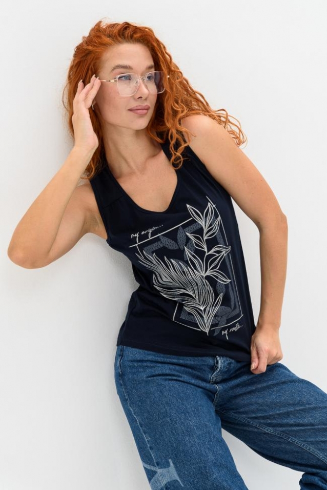 Майка прилегающего силуэта, с округлой горловиной. Полочка с кокетками. Горловина, проймы обработаны бейкой из основного полотна.