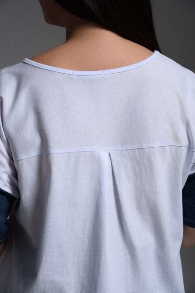 Футболка прямого силуэта, с округлой горловиной, с удлиненной спинкой, длиной до середины бедра. Низ полочки обработан вставкой из отделочного полотна. Спинка с кокеткой. Рукав короткий. В нижней части боковых швов обработаны разрезы. Горловина обработана бейкой из основного полотна.