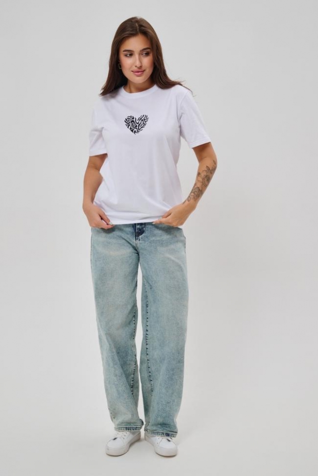 Женская футболка элегантного приталенного кроя с короткими рукавами и классическим круглым вырезом горловины. Минималистичный дизайн дополнен нежным принтом в форме сердца с узором зебры, создающими тонкий акцент на образ. Материал приятен к телу, обеспечивает комфорт и свободу движений. Идеально подойдет для повседневного стиля, подчеркивая женственность и утонченность облика обладательницы.