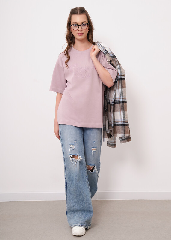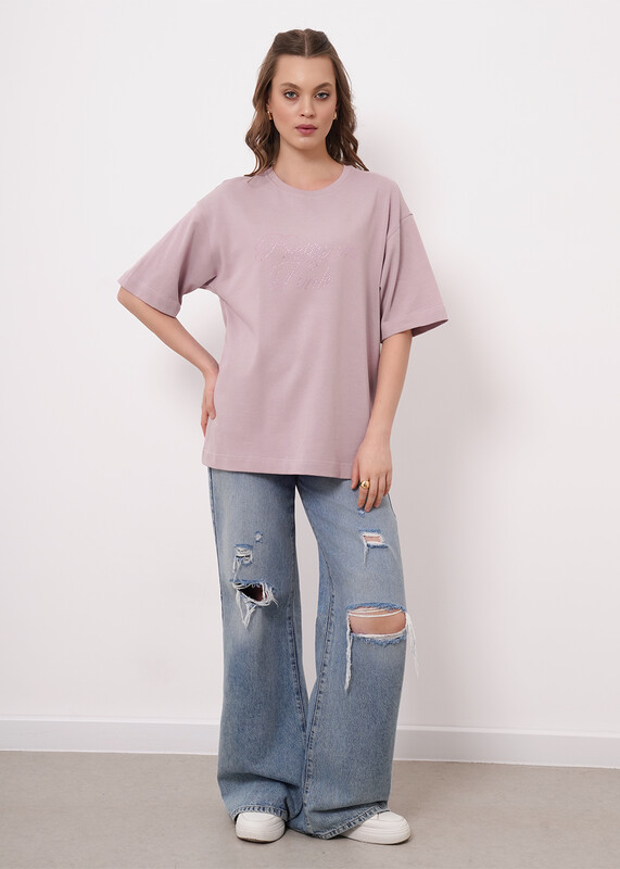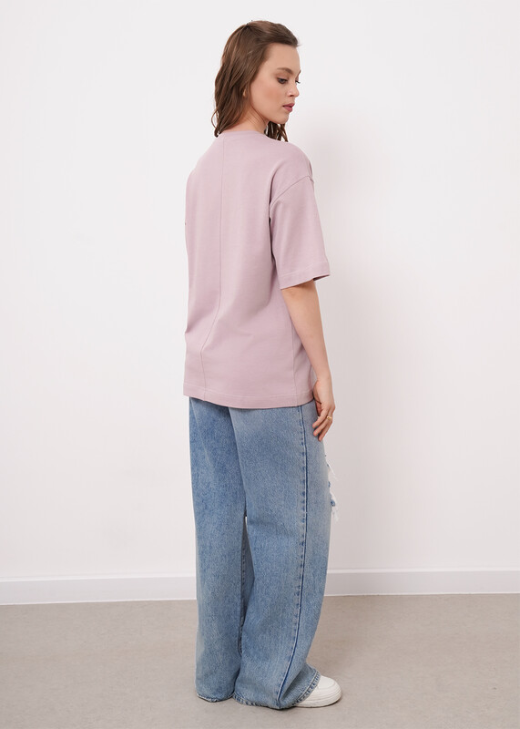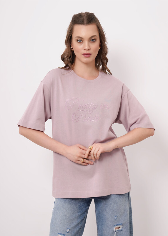 Футболка оверсайз из хлопкового трикотажного полотна. Короткий спущенный рукав. Округлая горловина с обтачкой из рибаны. По спинке средний шов. По переду термостразы.