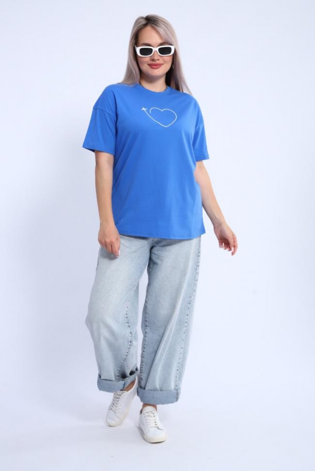 Футболка для женщин прямого силуэта, длиной до середины бедер. Рукав втачной, короткий. Горловина округлой формы. Полочка футболки украшена принтом.