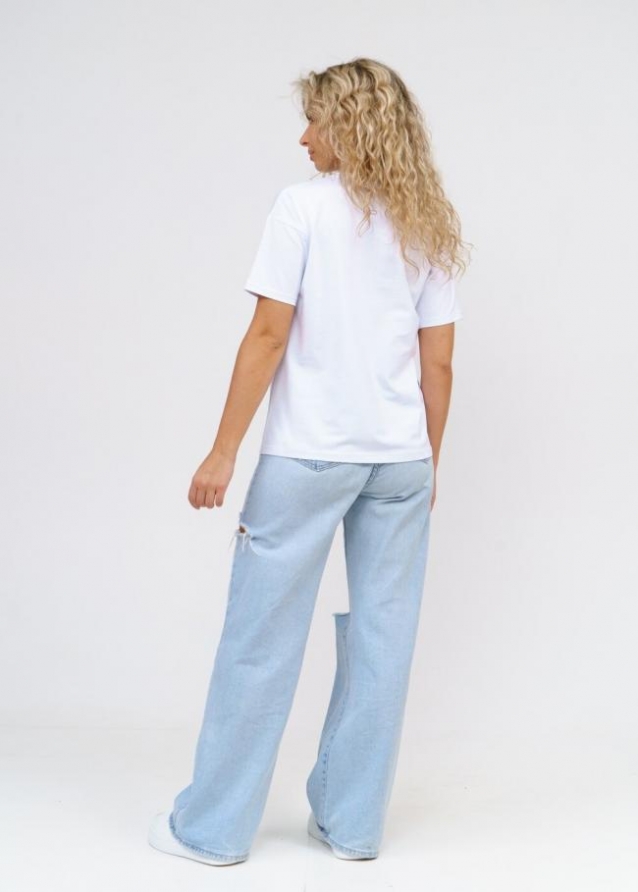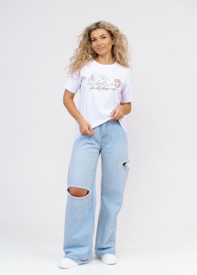 Футболка женская прямого силуэта, длиной до середины бедра. Рукав втачной, короткий. Горловина округлой формы. На полочку футболки нанесен принт.