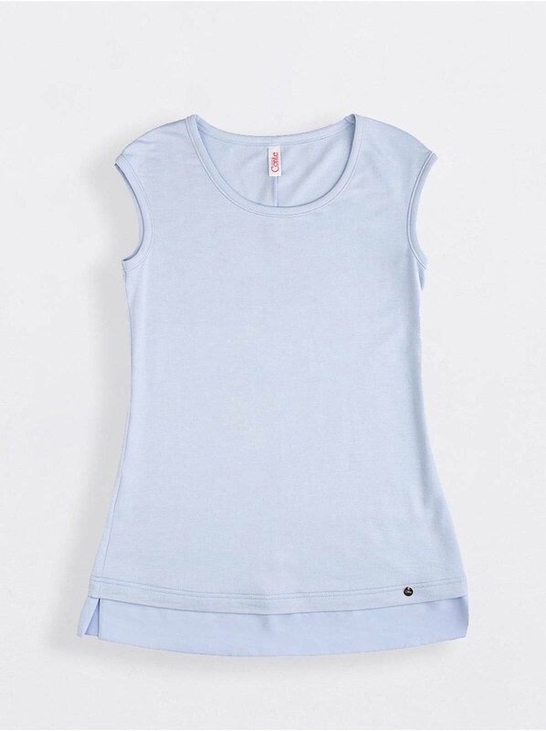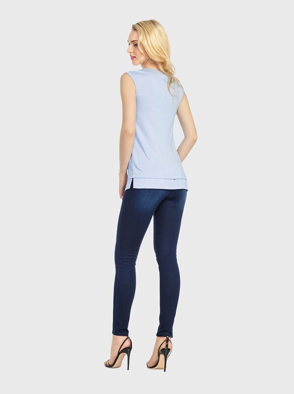 Джемпер женский без рукавов. Горловина и проймы окантованы с использованием люрексовой нити. По низу изделия отделочная деталь из шифона. По переду, по отделочной строчке с левой стороны пришит декоративный медальон.