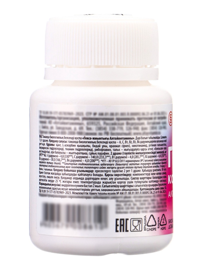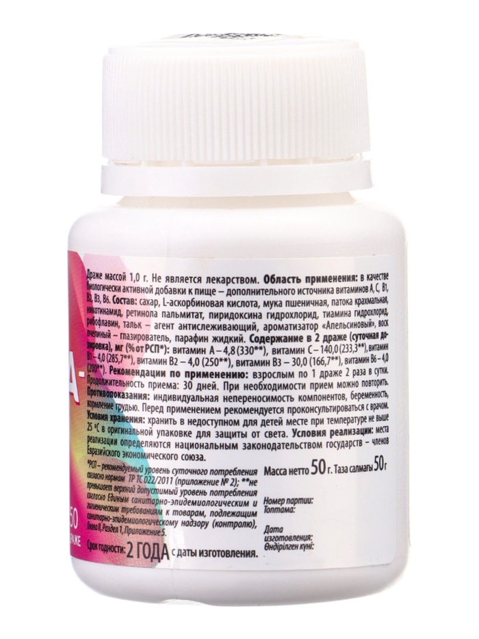 Габариты: 4,5 x 4,5 x 7 Доставка: Платная Страна: Россия В боксе: 40 шт Состав: См. на упаковке Материалы: см. на упаковке Фасовка: по 1 шт Индивидуальная упаковка: Без упаковки Сертификат: ЕАС Для кого: Унисекс В упаковке, шт.: 50 Возраст: Для взрослых Назначение: Для зрения, Для сердца и сосудов, Для нервной системы, Для иммунной системы Группа витаминов: Поливитамины Форма выпуска: Драже Показания: Укрепление иммунитета Действие: Общеукрепляющее Витамин А (ретинола пальмитат) – один из основных жизненно важных для человека витаминов. Витамин А участвует в формировании основного зрительного пигмента (родопсина), необходимого для нормального цветного и сумеречного зрения; обеспечивает правильное функционирование слёзных, сальных и потовых желёз. Принимает участие в синтезе иммуноглобулинов и интерферона, тем самым регулируя иммунитет и повышая общую сопротивляемость организма. Поддерживает нормальное состояние кожи и слизистых оболочек, помогая их естественной регенерации. Применяется для восполнения недостатка витамина А после перенесённых заболеваний кожи, глаз, желудочно-кишечного тракта и печени. Витамин С (аскорбиновая кислота) играет важную роль в жизнедеятельности организма. Он обладает сильным окислительно-восстановительным действием, участвует в регулировании углеводного и липидного обменов. Человеческий организм не способен самостоятельно синтезировать витамин С и получает его в необходимых количествах только при правильном питании. При несбалансированном рационе (в т.ч. диетах), стрессах, повышенных физических и умственных нагрузках, во время и после инфекционных заболеваний потребность в нем резко возрастает. Аскорбиновая кислота обеспечивает поддержку иммунитета, активизацию процессов регенерации кожи и мягких тканей, а также способствует усвоению витаминов группы B. Витамин В1 (тиамина хлорид) – жизненно необходимый витамин, который поступает в организм только извне и участвует в процессах обмена углеводов жиров, белков, а также в регуляции водно-солевого баланса. Недостаток витамина характеризуется общим упадком сил, головными болями, одышкой, желудочно-кишечными расстройствами и нарушениями в работе нервной системы. Витамин B1 обеспечивает её нормальное функционирование, поэтому своевременное восполнение нехватки тиамина важно при сильном нервно-психическом напряжении или тяжёлой физической работе. Витамин В2 (рибофлавин) играет активную роль в обмене веществ, принимая участие в синтезе гемоглобина. Кроме этого. одним из основных его свойств является поддержка зрительной функции глаз, за счёт сохранения нормального состояния роговицы и хрусталика. Рибофлавин также используется при комплексном уходе за кожей, склонной к раздражению и другим аллергическим реакциям. Витамин В3 (никотинамид) способен влиять на липидный обмен и регулировать содержание холестерина в крови. Благодаря этому Витамин В3 поддерживает правильное функционирование сосудистой системы, внутренних органов: сердца, печени, желудка, кишечника. Кроме этого, никотинамид используется при наличии на коже длительно незаживающих повреждений. Витамин В6 (пиридоксина гидрохлорид) принимает участие в синтезе различных аминокислот, в т.ч. ответственных за нормальную работу нервной системы человека. Кроме этого, витамин B6 помогает эф