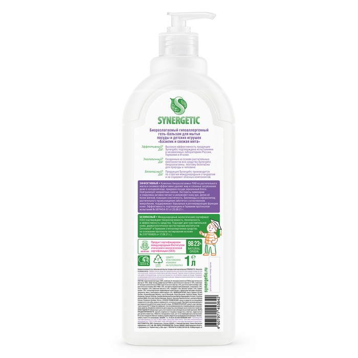 Габариты: 9 x 6,5 x 27 Доставка: Платная Страна: Россия В боксе: 8 шт Состав: См. на упаковке Материалы: см. на упаковке Фасовка: по 1 шт Индивидуальная упаковка: Без упаковки Сертификат: Не подлежит сертификации Вес, г/Объём, мл: 1000 Ароматизированные: Да Антибактериальное: Нет Вес/Объём: 1 л Биоразлагаемый гель-бальзам для мытья посуды и детских игрушек SYNERGETIC "Базилик и свежая мята" - это экологичное, безопасное и эффективное средство для мытья всех видов посуды, в том числе детской, кухонного инвентаря и детских игрушек от любых видов загрязнений. Он полностью смывается водой и не оставляет следов на посуде. Комплекс биоразлагаемых ПАВ из растительного масла и энзимов эффективно удаляет жир, сложные загрязнения и запахи даже в холодной воде, придавая посуде зеркальный блеск. Растительный глицерин в составе средства защищает кожу рук от сухости и раздражения. Экстракты ламинарии и спирулины активно питают и увлажняют кожу рук, делая ее более мягкой, повышая эластичность. Биолипиды и софоролипид растительного происхождения заботятся о естественном микробиоме, поддерживают барьерные и регенерирующие функции кожи. Гипоаллергенная парфюмерная композиция с эфирными маслами гвоздики, эвкалипта, мяты, апельсина и лемонграсса придает средству нежный и приятный аромат. Нанести средство на очищаемую поверхность или губку, вымыть поверхность, ополоснуть водой. При приготовлении моющего раствора используйте 5 мл средства на 5 л воды. Хранить отдельно от пищевых продуктов, в местах, недоступных для детей и животных. Использовать строго по назначению. Не употреблять внутрь. Избегать попадания в глаза и на повреждённые участки кожи. В случае попадания обильно промыть водой и обратиться за медицинской помощью. При проглатывании немедленно обратиться за медицинской помощью и предъявить упаковку средства. Не рекомендуется мыть в посудомоечной машине фарфор, посуду из хрусталя, серебра, алюминия, меди, латуни, дерева, а также посуду, декорированную золотом или серебром. Таблетки не защищают от механических повреждений. Состав: Цитрат натрия > 30%, карбонат натрия 15–30%, перкарбонат натрия 5–15%, комплекс растительных Н-тензидов (ПАВ из растительного масла) < 5%, натрия метасиликат < 5%, TAED < 5%, энзимы (без ГМО) < 5%, поликарбоксилат натрия < 5%, краситель пищевой < 0,5% Комментарии к товару