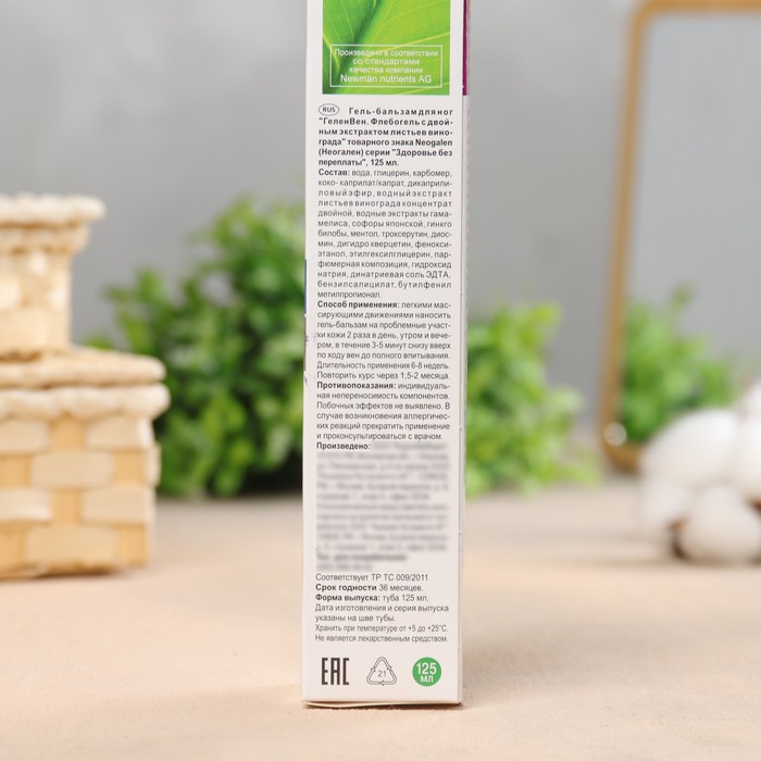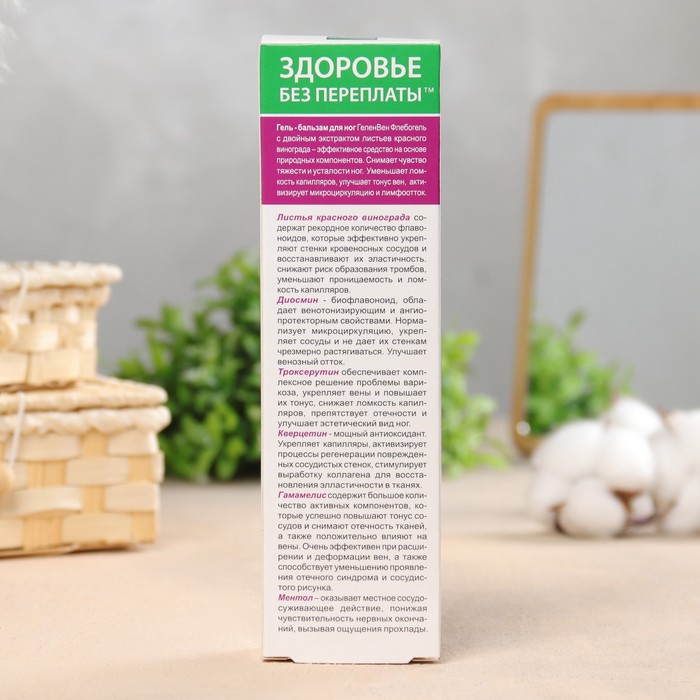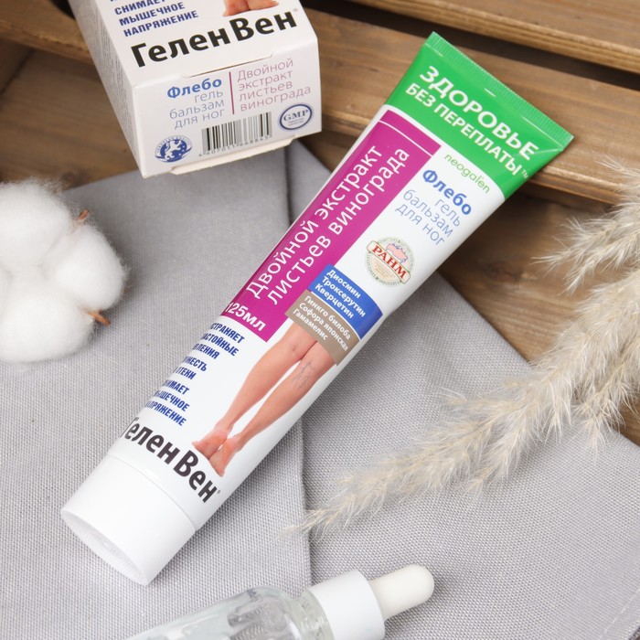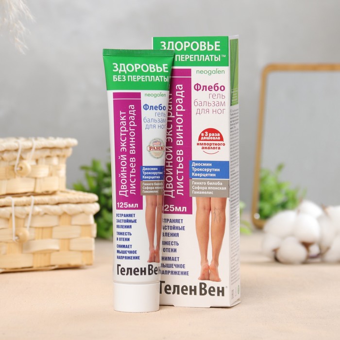 Габариты: 20 x 6 x 4 Страна: Россия В боксе: 40 шт Состав: См. на упаковке Материалы: см. на упаковке Фасовка: по 1 шт Индивидуальная упаковка: Цветная коробка Сертификат: ЕАС Вес, г/Объём, мл: 125 Фиксированная цена: Да Гель-бальзам "Вен Флебогель" с двойным экстрактом листьев винограда - это уникальное средство для ухода за ногами и снятия усталости. Каждая упаковка содержит 125 мл геля-бальзама. Этот гель-бальзам специально разработан для укрепления и ухода за ногами, особенно при повышенной нагрузке или чувствительности. Он содержит двойной экстракт листьев винограда, который обладает уникальными свойствами для укрепления стенок сосудов и улучшения микроциркуляции. Гель-бальзам "Вен Флебогель" помогает снять усталость и тяжесть в ногах, улучшает их состояние и оказывает успокаивающее действие на кожу. Экстракт листьев винограда способствует сужению сосудов, укреплению их стенок, а также улучшению кровообращения. В результате ноги становятся более свежими, отдохнувшими и сияющими. Для использования геля-бальзама "Вен Флебогель" нанесите небольшое количество на чистую и сухую кожу ног. Массируйте гель-бальзам до полного впитывания. Рекомендуется использовать гель-бальзам после душа или перед сном для максимального эффекта. Гель-бальзам "Вен Флебогель" с двойным экстрактом листьев винограда помогает укрепить сосуды, снять усталость и тяжесть в ногах, а также улучшить состояние кожи. Попробуйте этот гель-бальзам для облегчения нагрузки на ноги и достижения ощущения свежести и комфорта. Комментарии к товару